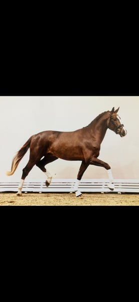 Offered is a dreamily beautiful Oldenburg dark chestnut, 3-year-old stallion registered with the Anglo European Studbook and thus freshly under saddle. Currently 172 cm tall. Sezuan’s Donnerhall x Don Gregory. Expressive, always eager to learn, motivated, and diligent. Already solid, fine to ride, and always easy to handle. His character is balanced and affectionate, attentive to people. No vices. X-ray findings without any objections. Of course, he is well-behaved for the farrier and loading. He is familiar with children, dogs, cats, tractors, etc. He is used to both open stable housing in a herd and loose housing. In the meantime, he has moved into a spacious box for training. So far, he is free from any injuries or illnesses. I am happy to send short video clips and important details via private message, but this does not replace an "on-site" viewing, getting to know him, and trying him out! Location: Germany.