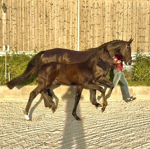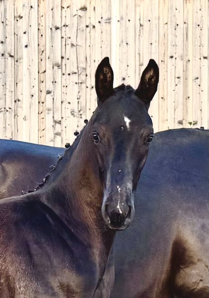 Stylish, eye-catching black stallion with strong movement and top pedigree! Full brother to the GP-successful mother.