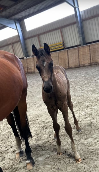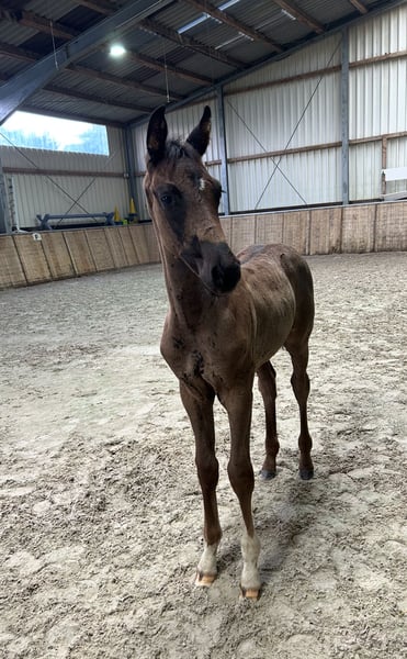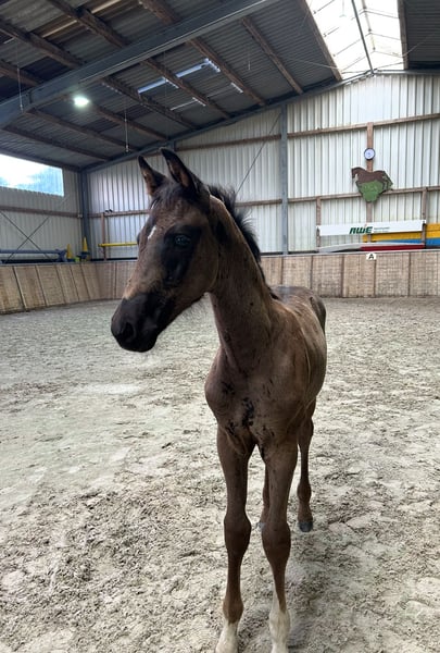 We are reluctantly selling our beautiful colt from loving breeder hands, sired by V Plus x Benicio. He is stunningly jet black with a fine blaze and two white front legs, paired with very solid basic gaits. He is surely destined for the higher levels of sport in the future; his pedigree leaves nothing to be desired with his father V-Plus (Vivaldi/Fürst Romancier) and his mother Bella (Benicio/Rohdiamant/Furioso II). Particularly noteworthy are his regulated walk and his powerful trot. His mother Bella is an exceptionally talented mare, who has one of the most rideable sires of our time, Benicio, as her father. Our Veterano was born on June 15, 2025, and he is growing up in a small, very harmonious herd with three other foals. He is, of course, regularly dewormed and has already been introduced to the farrier. For further videos and serious inquiries, please feel free to contact us at 0173/8547754. Veterano is only going to a top home with plenty of turnout!