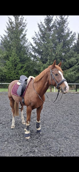 Divo ist ein 10 jähriger Oldenburger Wallach von Dimaggio x Santander . Er hat einen Stockmaß von ca 166cm. Er hat 3 schöne Gänge und einen Unkomplizierten Charakter. In der Dressur befindet er sich auf solidem A Niveau und beherrscht die Lektionen der Klasse L, allerdings nicht Tunierreif. Im Springen befindet er sich auf A* / A** Niveau. Im springen wurde er allerdings nicht regelmäßig gefördert, hin und wieder gelegentliche Lehrgänge und Springstunden. Erste Erfahrungen konnte er auch mit Geländehindernissen machen. Dort zeigt er sich sehr motiviert und lernwillig. Er benötigt einen ruhigen und sicheren Reiter, da er sich gerne aufheizt oder mal glotzig ist, daher nicht für Anfänger geeignet. Keine unarten wie bocken, durchgehen, steigen etc. Ich wünsche mir für ihn jemand mit Idealhaltung ( Paddockbox und o. mit täglichen Koppelgang) da er dazu neigt in Stresssituationen zu weben. Genaueres gerne Privat. 2024 hatte er eine Verletzung, welche vollständig ausgeheilt ist und ihn in keiner weise beeinträchtigt (klinikbericht vorhanden). Kleine AKU von 2020 und Rögtenbilder von allen 4 Beinen liegen vor. Auf Wunsch kann eine erneute AKU gemacht werden. Wurde regelmäßig geimpft, entwurmt, sowie jährliche Physiotherapie. Er wird unter Wert verkauft, da er seit mehreren Monaten Schwangerschaftsbedingt meinerseits nur sporadisch geritten wurde und sich aktuell nicht in Bestform (reiterlich) befindet. Platz vor Preis Passender Dressursattel von Kiefer (2023 gekauft) kann auf Wunsch mit Erworben werden. Bei Fragen oder Interesse gerne melden Videos können bei Interesse gerne geschickt werden +491604917189
