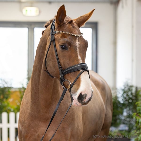 Imposant in der körperlichen Ausprägung, aber umso einfacher in der Bedienung, umso ausgeglichener im Temperament und umso mehr Sicherheit ausstrahlend, ist Vendaval zu beschreiben. Nach kurzer Gewöhnungszeit werden auch weniger erfahrene Reiter sein offensichtliches Talent bedienen können: ruhiger Trabablauf mit Kadenz und viel Raumgriff im Vorderbein. Turniererprobt und absolut ehrlich bleibt er auch in ungewohnter Umgebung gelassen und konzentriert bei der Arbeit. Seit er vierjährig ist, befindet sich der zehnjährige Vendaval im Besitz seiner Reiterin und wurde von ihr kontinuierlich bis zur mittelschweren Klasse gefördert. Lediglich in 2025 bescherte die Familienplanung seiner Reiterin eine Auszeit; sie nahm erst zum Verdener Videotermin wieder Platz im Sattel von Vendaval. In dieser besonderen Situation aus Organisation und Betreuung eines Säuglings durch die Reiterin zeigte sich dann auch in vorzüglicher Weise der Charakter, die Unkompliziertheit und die Verlässlichkeit von Vendaval. Sportname: Vendaval 7 Sporterfolge: DRE (Dressur) Klasse A1 (Dre A*): 2/2; 1/w Klasse L1 (DRP-L): 1/5 Klasse L1 (Dre L*): 1/4 Klasse M1 (Dre M*): 2/3 DPF (Dressurpferdeprüfung) Klasse A (Dpf A): 2/4; 1/w Klasse L (Dpf L): 1/3; 1/w 1. Generation Sportpferde Dressur: Barolo M v. Bordeaux (DRE: S* mit Philippa Hodes); Quattro v. Quaterback (DRE: S*). Bes. Prämientöchter: Sunshine M v. Quaterback; Elfenspiel v. Bordeaux; Elfen-Valencia v. Vivaldi. 2. Generation Sportpferde Dressur: Elfenfeuer v. Florencio I (DRE: Grand Prix mit Alice Tarjan); Dimanche Royal v. De Niro (DRE: Grand Prix mit Molly Schiltgen); De Luxe v. De Niro (DRE: S*); Fürst Olli v. Fürstenball (DRE: M*). Bes. Prämientöchter: Elfendiamant v. Rohdiamant; Solera v. Rohdiamant; Elfendream v. De Niro; Elfenmelodie v. Fürstenball; Elfenlaune v. Gey Flanell. 3. Generation Sportpferde Dressur: Lavinia v. Sion (DRE: PSG/Inter I); Prince Figaro v. Prince Thatch (DRE: PSG/Inter I mit Marissa Sequerth). Bes. Prämientöchter: Elfensonne v. Sion; Elfensonde v. Sion; Elfentanz v. De Niro; Elfentänzerin v. Don Daxau. 4. Generation Sportpferde Dressur: Don Vito v. De Niro (DRE: M**); Denigo v. De Niro (DRE: M**); Shogun v. Sion (DRE: M*). Bes. Prämientöchter: Elfenschein v. Figaro; Elfentanz v. Figaro; Elfenfeuer v. Shine On; Elfenguete v. De Niro; Elfenlady v. Don Gregory. Mutter: Solera ZL: 11/11 Turniererfolge: RPF: ohne Klasse 1/1. 1/3. Großmutter: Elfensonne ZL: 19/15