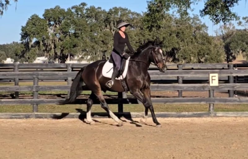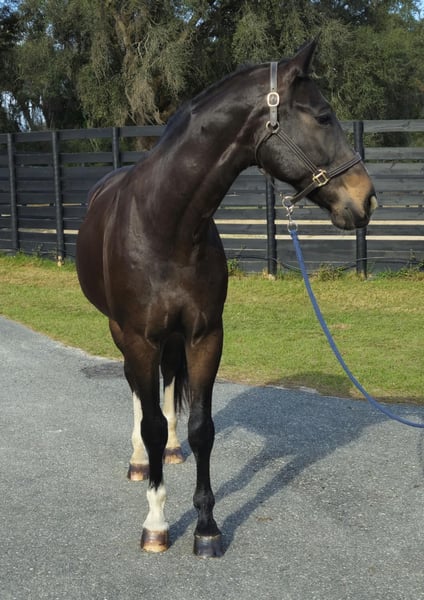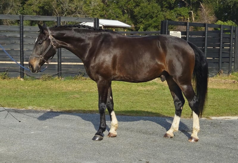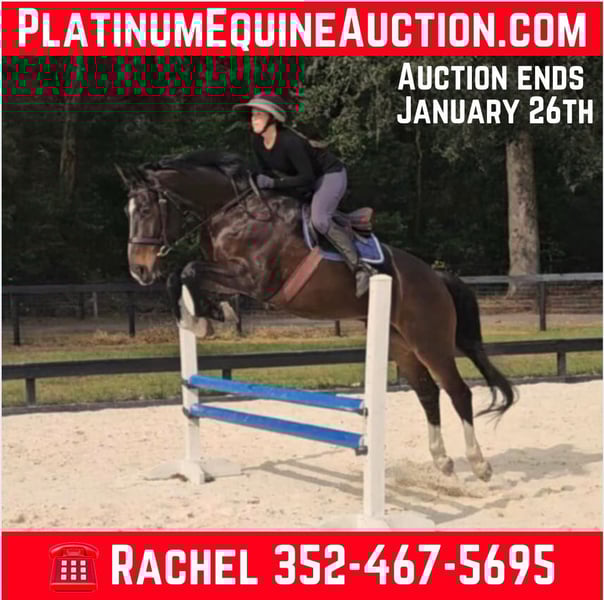ONLINE AUCTION Place your bids at www.PlatinumEquineAuction.com Starting Bid $3500 Auction ends January 26th, 2025 Need a new saddle? Check out White Rock Saddles on our website or Facebook! Introducing the stunning 10yr 16.3h Warmblood gelding Raphael! Rotspon x Rubin Cortes x Karon Raphael is a Premium GOV Oldenburg lifetime registered with USHJA and USDF. Raphael is trained through 2nd level dressage and jumps around a 2’6″ course with scope for higher. He jumps cross country, trail rides, and works cows. He is a nice all-around type. His perfect rider would be an intermediate or advanced teen or AA looking for a horse to move up the levels in eventing or H/J. Raphael loves jumping! It is his favorite discipline. He has a smooth easy jump that is nice for riders that are new to jumping and still learning. He keeps an even pace around a course and maintains the same speed before and after each jump. He is tolerant and forgiving over fences and doesn’t mind if the rider can’t see a distance, chips, or sits back too early. He is the same to jump whether you ride every day or once a week. Although Raphael would prefer a rider who will spend every day at the barn doting on him. He loves attention and has a big personality. Raphael regularly hauls off-site for lessons and other riding activities. He is easy to haul and doesn’t mind traffic, construction, or dogs running underfoot. Raphael is a barefoot easy keeper and is up-to-date on shots, Coggins, deworming, sheath cleaning, hoof trimming, and floating. Please watch his video and call Show Me Sport Horses Rachel 352-467-5695 with any questions. Video shows multiple riders new to jumping taking him around a course (to show how saintly he is with riders learning to jump that make mistakes) as well as several off-site dressage lessons (to show how nice he rides in a new location). Raphael is offered with no reserve as we are selling our farm and need to downsize a few of the horses. Located in Ocala, FL, shipping available anywhere in the US or Canada. ONLINE AUCTION Place your bids at www.PlatinumEquineAuction.com Starting Bid $3500 Auction ends January 26th, 2025 Need a new saddle? Check out White Rock Saddles on our website or Facebook!