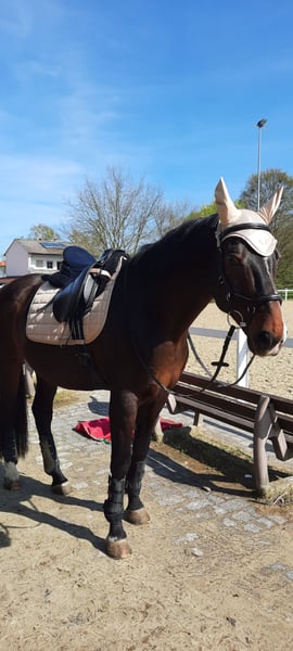 Muri geboren am 1.4.2008 ist ein sensibler und feiner Wallach mit hervorragenden Grundgangarten und einer sehr guten Einstellung zur Arbeit. Er möchte immer seinem Menschen gefallen und überzeugt durch Ehrlichkeit und sein großes Herz. Aus Rücksicht auf sein Wohlbefinden soll Muri nicht mehr im Turniersport eingesetzt werden , da ihn das zu sehr stresst. Als Freizeitperd fühlt er sich deutlich wohler. In Neuen oder ungewohnten Situationen kann Muri umweltorientiert reagieren, ist dabei aber nie böse. Aufgrund seiner Feinheit im Maul und der sensiblen Art ist er nicht für reine Anfänger geeignet. Für jeden der sein Reit und Feingefühl weiterentwickeln möchte ist er der tollste Lehrmeister den man sich wünschen kann. Mit ihm lassen sich Lektionen fühlen und reiten die man nur aus Büchern kennt. Im täglichen Umgang ist er ein wahrer Schatz. Er liebt Kinder, genießt Aufmerksamkeit läßt sich gerne betüddeln, schmusen und kraulen. Mit anderen Pferden ist er verträglich und geht Stress lieber aus dem Weg. Muri wird mit komplettem Zubehör verkauft darunter Sattel, Trense, Gamaschen, Decken usw. Im letzte Jahr hat Muri eine COPD entwickelt die in der Uni Gießen abgeklärt wurde. Mit bedampftem oder nassem Heu ist er ohne Symptome und kann uneingeschränkt belastet werden. Medikamente benötigt er keine. Gesucht wird ein liebevolles, pferdegerechtes Zuhause bei Menschen mit Feingefühl, die diesen besonderen Wallach zu schätzen wissen Carina und Muri
