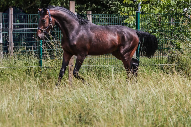 Dexter is now 3 years old and ready to be brought into work. He is becoming more handsome with each passing day, and I believe he is aware of it. Currently, he enjoys running freely and occasionally jumping without any restrictions. He has a small chip on his front leg, but it can be easily removed; he has never been lame, which is why he is offered at a more affordable price. He possesses excellent fundamental qualities, with a very active hindquarters.