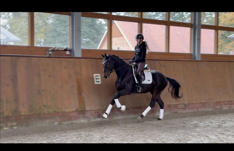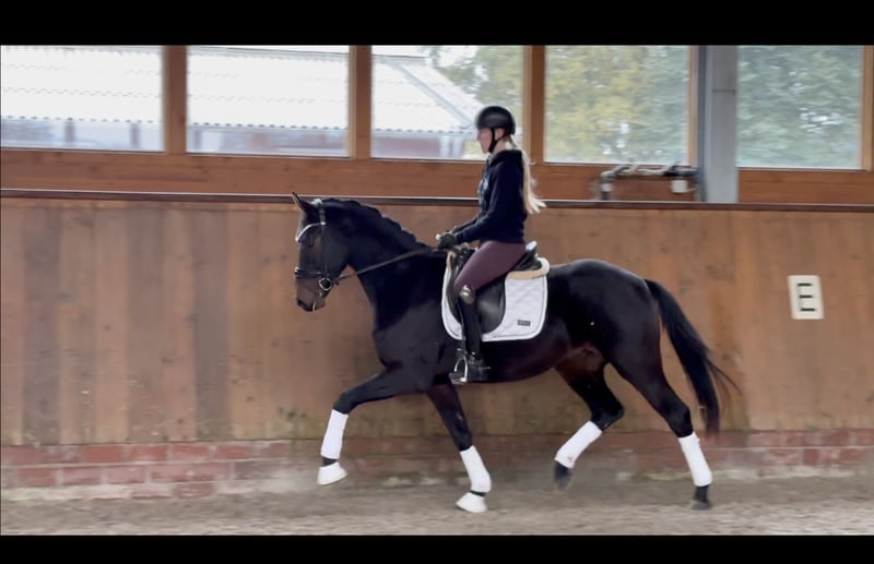 Bumbledee hat uns von Anfang an mit seiner eleganten Art verzaubert. Der Wallach steht noch voll in der Entwicklung und wurde im September schonend angeritten. Er überzeugt mit einem tollen Charakter, den er definitiv von seiner Mutter geerbt hat. Ohne ablongieren einfach aufsteigen, auch wenn mal ein Tag Pause war. Der dunkelbraune Wallach besticht durch sein elegantes Erscheinungsbild und sein angenehmes Temperament. Er zeigt sich sehr talentiert und lernwillig für den Dressursport. Aktuell ist "Bumbi" noch etwas überbaut und läuft ohne Eisen.