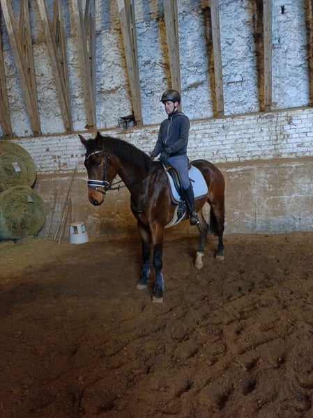 Ce cheval de selle patient recherche une nouvelle famille qui pourra l’épanouir. Son pas au-dessus de la moyenne, son trot souple et son galop solide en font un partenaire intéressant autant en dressage qu’en loisir, grâce à son tempérament sincère et calme. Actuellement, il est préparé pour la vie de cheval de sport. Son niveau exact doit être confirmé. Il est en bonne santé, sans vices ni limitations. Mise à jour : il supporte désormais le poids du cavalier en pas et en trot à l’élastique. L’AKU et le transport peuvent être négociés. Un TÜV à ses frais est possible.