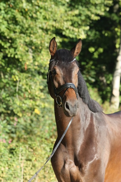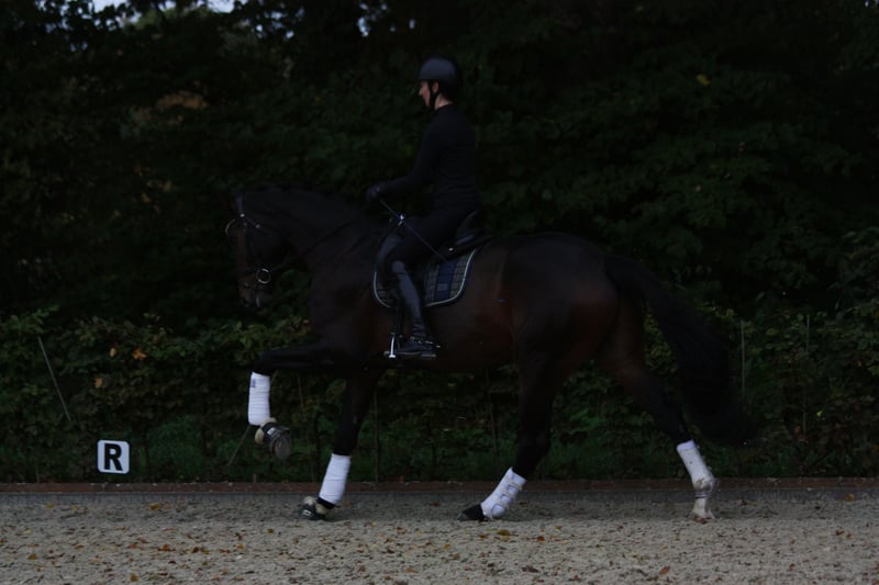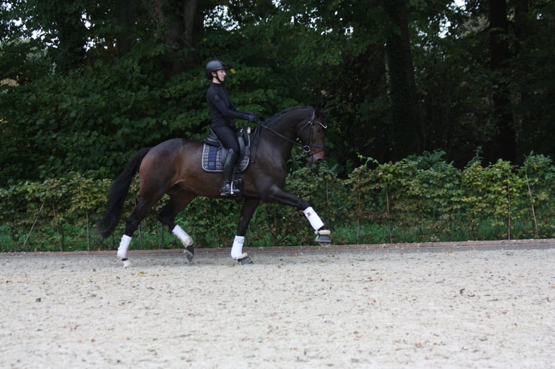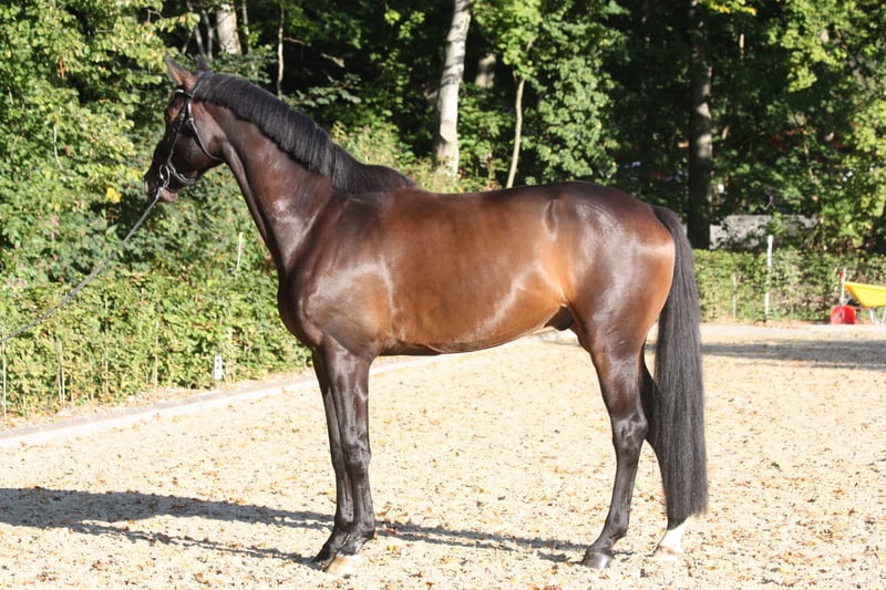 Rittige, typvolle dressuurafstammeling met drie zeer goede basisgangen - Uitstekende galop: groot, uitgebalanceerd, bergop - Zeer goede stap: duidelijk in takt, losgelaten, veel ruimtegrip Draf met bijzondere mechaniek: actief vanuit de achterhand, elastisch voorbeen Al geplaatst in een rijpaardproef, met een zeer goede instelling onder het zadel. Duidelijk in het hoofd, vriendelijk in de omgang, aangenaam om te zitten. Locatie Bad Zwischenahn