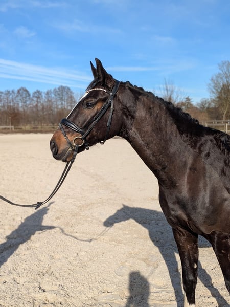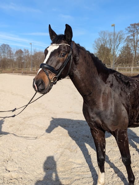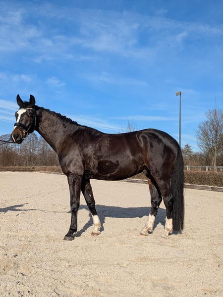 Zum Verkauf steht ein 5-jähriger Oldenburger Wallach, der nicht nur mit seiner schönen Aufmachung, sondern auch mit seinem großartigen Wesen überzeugt. Voraussichtliches Endmaß ca. 1,67 m – also ein sportlicher Allrounder im handlichen Format. Er begeistert mit qualitätsvollen Grundgangarten, ist leichtrittig, gelehrig und seinem Alter entsprechend ausgebildet. Einfache Wechsel, Aussengalopp und Kurzkehrt stehen zur Zeit im Fokus. Dabei zeigt er sich stets motiviert und aufmerksam – ein echter Partner. Erste Turniererfahrung wurde Ende 2025 gesammelt und er zeigte sich jederzeit entspannt und aufmerksam. Von Fohlen an in Familienhand aufgewachsen, kennt er den behutsamen Umgang und hat einen unerschütterlichen, kinderlieben Charakter. In der gesamten Zeit war er nicht einmal lahm oder ist wegen anderen Krankheiten ausgefallen. Er ist verlade- und schmiedefromm, kennt das Gelände und zeigt sich im Springtraining mutig und unerschrocken. Trotz des kalten Winters hat er sich stets von der besten Seite gezeigt, nie gebuckelt oder unter dem Reiter Unsinn gemacht. Röntgenbilder aus 11/24 vorhanden und ohne Befund. Abgegeben wird er schweren Herzens und nur aus Zeitmangel in beste Hände.