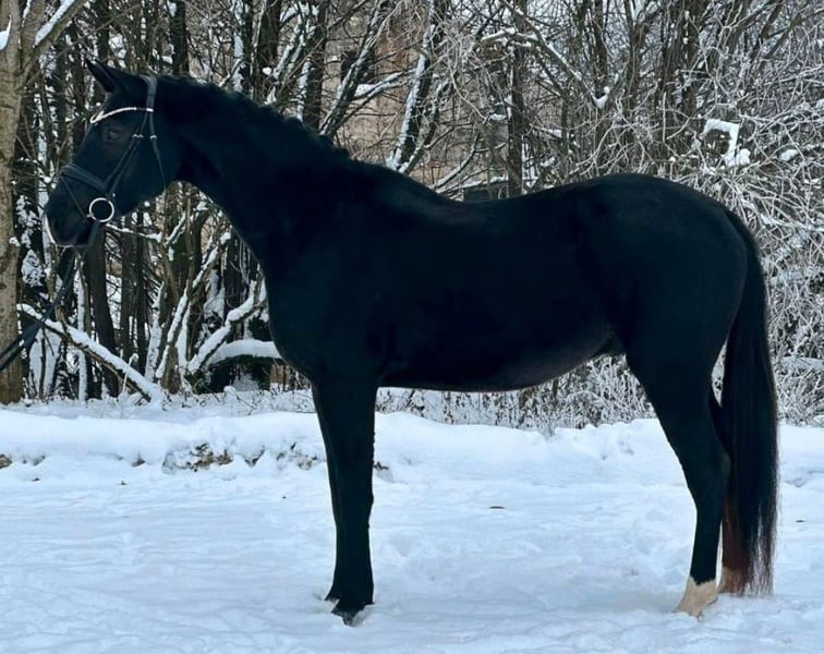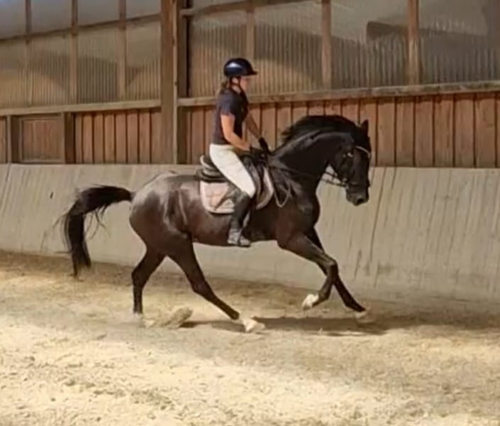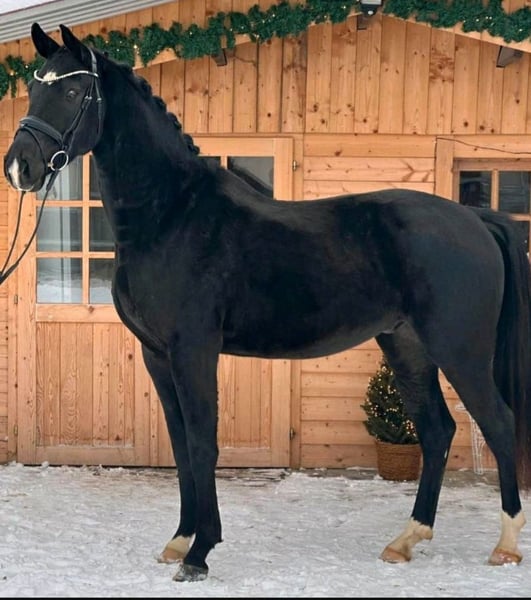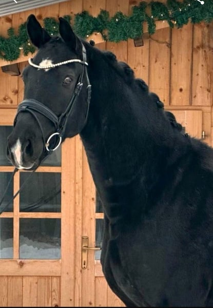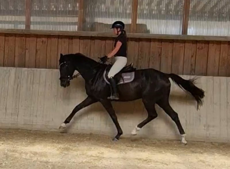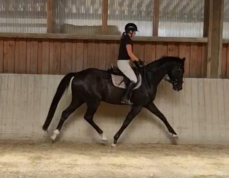 Our handsome 5-year-old gelding "Danse" by De Niro Gold is looking for a new carrot giver. He is very sweet to handle and gets along well with other horses. He is registered as a competition horse and was presented as a riding horse at the age of 3. Last winter, he underwent a successful chip operation and has otherwise excellent X-ray images. He is fully capable of work again and is at a Dressage A level. Danse is also familiar with working on the lunge and from the ground. In terms of build, he is rather delicate, so he is not a weight carrier but rather a fine ladies' horse. He is currently barefoot and is very well-behaved with the farrier.