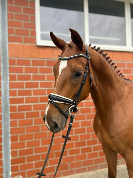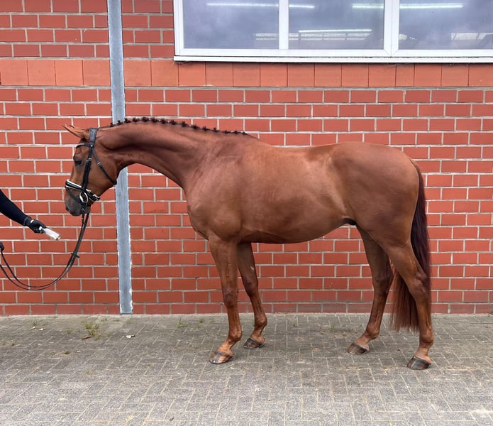Elegant Oldenburg gelding for sale – ideal for dressage! This charming chestnut gelding was born in 2021 and impresses with his friendly nature and striking appearance. Standing at 16.1 hh, he offers the perfect size for ambitious riders who value quality and willingness to perform. The Oldenburg is well-suited for dressage and already demonstrates considerable talent and movement enthusiasm. His elegant presence and pleasant temperament make him a reliable partner for training and competitions. If interested or for further information, please feel free to contact me. A visit can be arranged by appointment.
