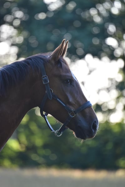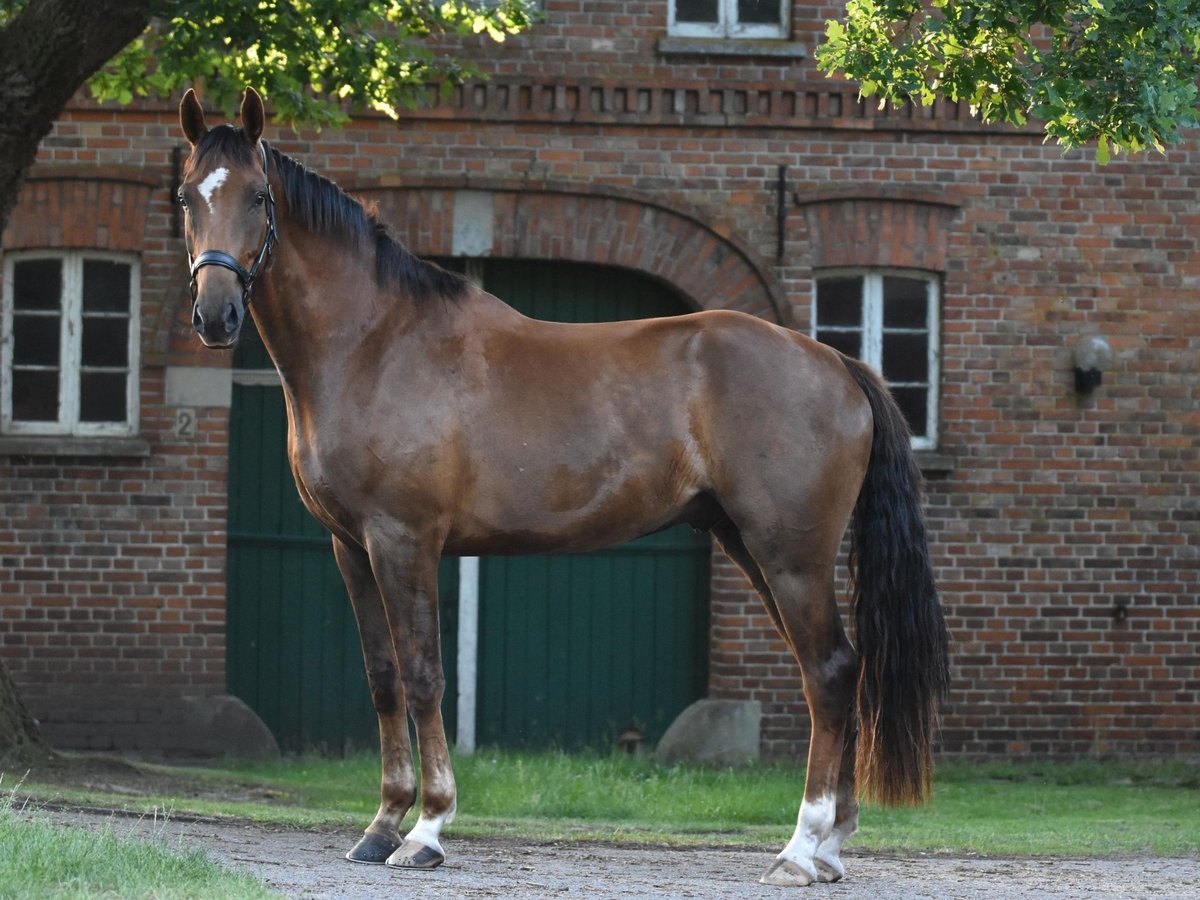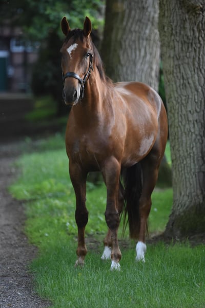 This four-year-old dark chestnut gelding (approximately 16.1 hh) comes from a reputable breeder and impresses with his calm demeanor, reliability, and well-balanced temperament. His sire is Total Hope, a son of Totilas and Weihegold OLD, successful up to Grand Prix level. The dam line, featuring Blickpunkt (Belissimo), Donnerball, and Quattro B, boasts excellent dressage bloodlines. He has been gently started under saddle and demonstrates a ground-covering walk, a regular trot, and a strong uphill tendency in canter. In handling, at the blacksmith, and during loading (even alone), he is always well-behaved and uncomplicated, also safe around children. Thanks to his completely confident nature and fearless attitude, we see Torsti as an ideal prospect for riders transitioning to higher levels or as a family horse. He could also be interesting for vaulting, although this has not yet been tested. Currently, he is kept in a paddock with a small mixed herd. X-rays are available. An honest, high-quality gelding with a promising future, still at the very beginning of his career as a riding horse – sold directly from the breeder to a good home.