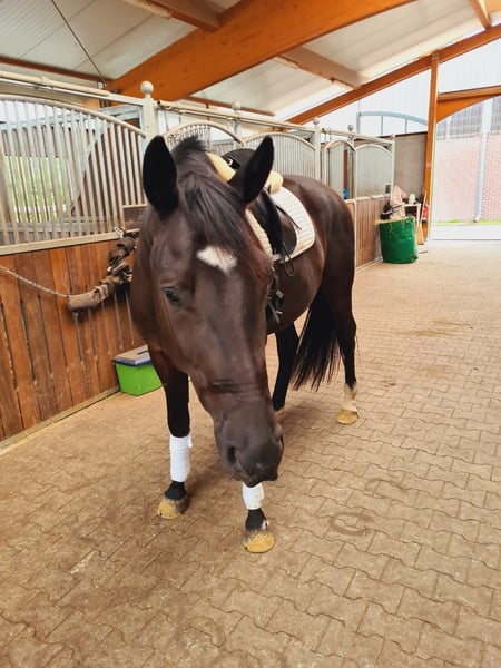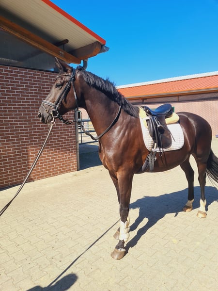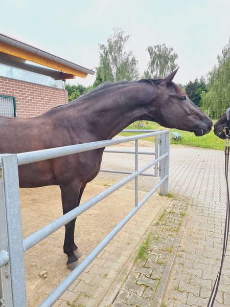 With a heavy heart, I am parting with my beautiful five-year-old black gelding, as I can no longer give him the time he deserves. He is an Oldenburg and is sired by Negro x Gribaldi, standing at approximately 173 cm. He is well-suited for elevated leisure riding as well as for beginners in competitions. He was awarded by the Oldenburg Association as a foal in 2020. He is strong-minded, competition-experienced, honest, and kind in handling, and he is also good for shoeing and loading. He has mild shivering, which only shows when giving his hooves. There is no noticeable issue when riding. He backs up without any problems. He is chipped, vaccinated, dewormed, and has an Oldenburg passport. I am selling him privately. To avoid riding tourism, trial rides are possible for a fee of 40 euros and will be deducted from the purchase price upon contract conclusion. He can only be given to loving and supportive hands. A good home is more important than the price. If interested, please contact me with your phone number via eHorses, and I will call you back promptly.