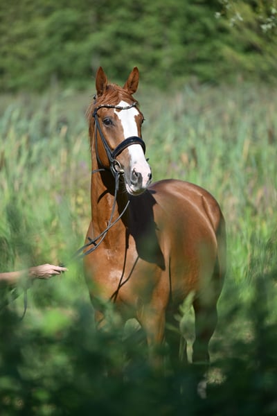 🌟Eye-catching standout with sporting potential!🌟 5-year-old Oldenburg gelding by Sezuan x Ampere Are you looking for a striking, rideable partner with prospects for dressage? Then this charming Oldenburg gelding (2019) is just right for you! Pedigree: Sire: Sezuan – multiple dressage horse world champion Dam: Ampere – known for rideability and movement quality Exterior & Interior: • approx. 172 cm tall, modern type • Expressive chestnut with a blaze – an absolute head-turner! • Well-mannered, easy to ride, and eager to learn Training: • Secure at dressage horse A-level • Shows three good, rhythmical basic gaits • First competition starts are planned – ready for the next step! • In the field, he shows himself fearless and with great joy Field of Use: Perfect partner for ambitious amateurs or young riders with sporting ambitions – plenty of potential for the future!