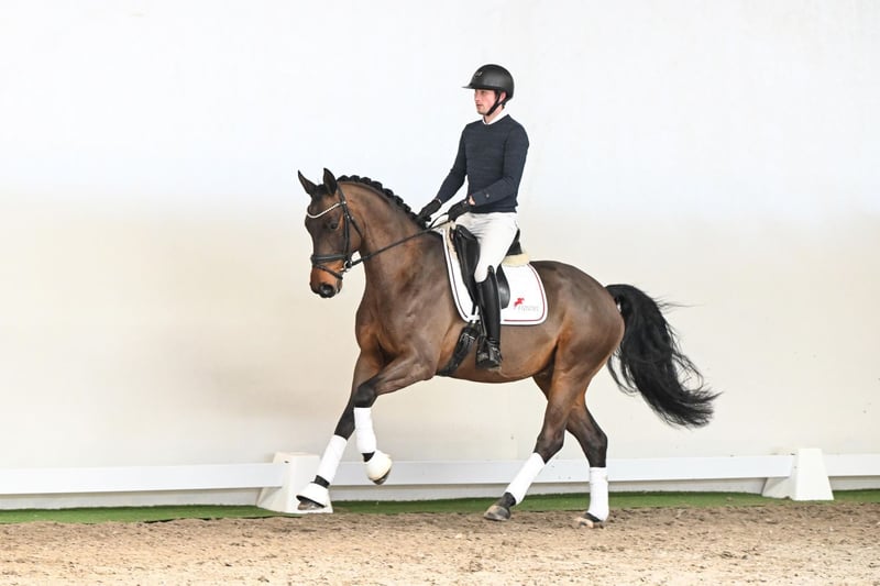 This 6-year-old gelding presents himself as a likeable and honest young prospect who has not yet been shown in public. With his well-proportioned size, an attractive outline, and natural elegance, he makes a very harmonious overall impression. In trot, he is expressive, rhythmical, and moves consistently through his body – comfortable to sit and always easy to regulate. Overall, he is a horse that demonstrates clear, correct, and appealing movement. Particularly noteworthy is his rideability: well-behaved, uncomplicated, and attentive to the rider’s aids. He gives a secure feeling under saddle and impresses with his cooperative attitude in daily work. A horse that is simply a pleasure to ride and presents himself as a reliable partner. His pedigree is equally appealing: his sire, Fynch Hatton, stands for modern dressage quality and excellent rideability. On the dam’s side, Top Gear OLD – especially renowned for his outstanding character and rideability – further reinforces these traits. Combined with Hotline and Sandro Hit, he offers proven and solid dressage genetics. An ideal horse for riders seeking an uncomplicated, rideable, and genuine partner for both everyday enjoyment and success in dressage sport.