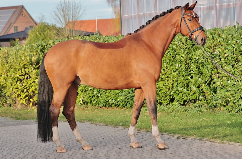 Hanovrien, hongre, 5 ans, 1,76 m, Vaderland x St. Moritz Ce magnifique hongre se distingue par ses trois allures de base supérieures à la moyenne, une excellente maniabilité et un caractère fantastique. Vatti fait preuve d'une motivation constante, d'une grande volonté d'apprendre et d'une fiabilité à l'entraînement quotidien – un partenaire idéal pour le cavalier de dressage ambitieux. Déjà victorieux en épreuves de dressage de niveau L et actuellement formé jusqu'au niveau M, il possède toutes les qualités requises pour évoluer dans le haut niveau du dressage. Son pedigree ne laisse rien à désirer : Vaderland, réputé pour son arrière-main puissant, sa capacité exceptionnelle à rassembler et sa grande facilité de dressage, transmet dynamisme et expressivité. Par St. Moritz, un sang éprouvé pour la légèreté, la volonté de performer et un tempérament équilibré, est également présent. Grâce à son apparence moderne, son équilibre naturel et sa tête claire, Vatti est particulièrement adapté aux cavaliers de dressage ambitieux à la recherche d’un partenaire sincère, motivé et performant pour leur parcours sportif. Pour toute demande ou vidéo, merci de contacter par téléphone ou WhatsApp au +41 (0)76 475 45 13 Localisation : Warendorf, Allemagne