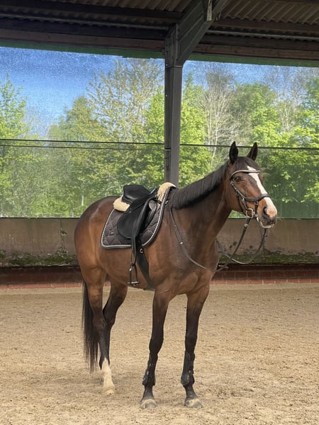 Dear English Thoroughbred Mare for Sale (2015*, approximately 16.1 hh, by New Approach out of Nashmiah) Sina is familiar with dressage work in our indoor arena, as well as small jumps, and she behaves well on the longe and double longe. She also knows trail riding, although I haven’t done this very regularly with her. As a typical mare, she can sometimes be a bit temperamental, for example when grooming or tacking up. Otherwise, she is well-behaved and very cooperative with handling. I have ridden her mainly in leisure dressage and occasionally done small jumps. She has always performed well and shown a strong willingness to learn. At the moment, she could likely benefit from more consistent training and mental and physical engagement, but unfortunately, I lack the time due to my own training commitments. She is accustomed to the vet, farrier, and dentist, and traveling with a trailer is no problem. She currently shares her paddock with a gelding and a mare. All accessories (dressage saddle, jumping saddle, bridle, rugs, etc.) can be purchased additionally. A trial ride is of course possible. The price is negotiable; please feel free to contact me initially. ☺️