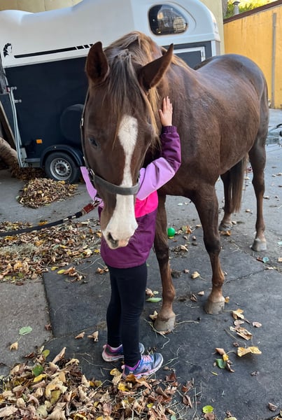 The mare "Kisses of Fire" is a large-framed 11-year-old Thoroughbred mare. She has spent several years in breeding (always uncomplicated with beautiful foals) and is now being retrained under saddle. She is relaxed, has a good temperament, a gentle nature, and is well-behaved in handling. We work with her according to the principles of natural horsemanship. She is familiar with groundwork, walks, and is herd-compatible. Grooming, leading, picking out her hooves, bridling, tacking up, and loading into the trailer are all done easily. She enjoys the company of children. Her horse passport shows that all vaccinations and examinations have been up to date since her birth. She is in excellent health and is looking forward to her new role as a riding horse, family horse, and possibly for breeding or as a broodmare in warmblood breeding. Last year, one of her three-year-old offspring was under saddle with us – a truly dream horse. Her price will increase with further training. Serious inquiries are welcome. By appointment, our "Kissy" can be viewed.