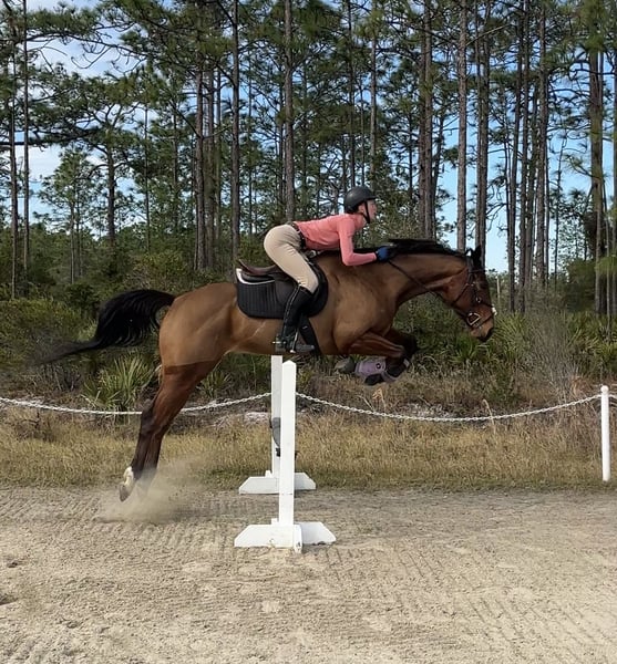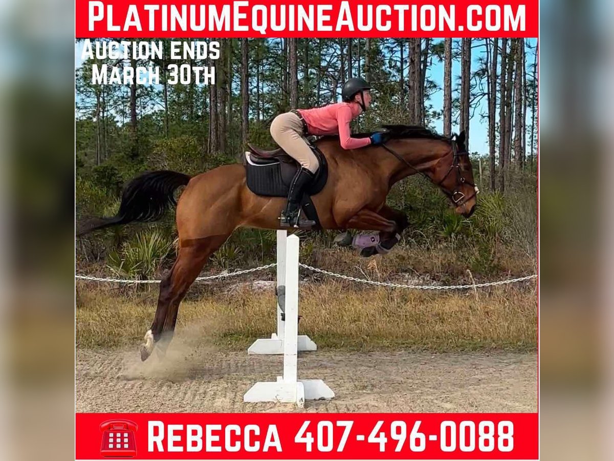 ONLINE AUCTION Place your bids at www.PlatinumEquineAuction.com Starting Bid $3500 Auction ends March 30th, 2025 Need a new saddle? Check out White Rock Saddles on our website or Facebook! Looking for a horse with talent, a sweet personality, and a bright future? Meet Mālie JC Pauciloquent, a stunning soon to be five year old Thoroughbred mare standing at 16hh (and still growing). She is the total package—versatile, kind-hearted, and built to turn heads in the hunter, jumper, or equitation ring. Mālie is an old soul – she is easygoing, even-tempered ride, perfect for someone who values a partner that takes care of their rider. She has transitioned beautifully from the track to her new career, with a natural aptitude for jumping and a calm, confident demeanor that makes her an absolute joy to handle. Barefoot, easy to load, and a pro for both farrier and body clipping, this horse is as straightforward as they come. Whether you’re a junior, an amateur, or a pro looking for your next project, Mālie is ready to shine. Where is she in her training? As of the new year, she’s has been started over fences—and she absolutely loves it! She has fabulous lead changes which continue to come more automatic with each ride. She is also coming along with building balance and suppleness on the flat. Every ride brings noticeable progress, and she’s steadily learning to reach for contact. She is ready to start in your program! Estimated scope 2.0 m+ PPE welcomed and she will pass with flying colors! For more info contact Rebecca Rodriguez 407-496-0088 Located in Christmas, FL. ONLINE AUCTION Place your bids at www.PlatinumEquineAuction.com Starting Bid $3500 Auction ends March 30th, 2025 Need a new saddle? Check out White Rock Saddles on our website or Facebook!
