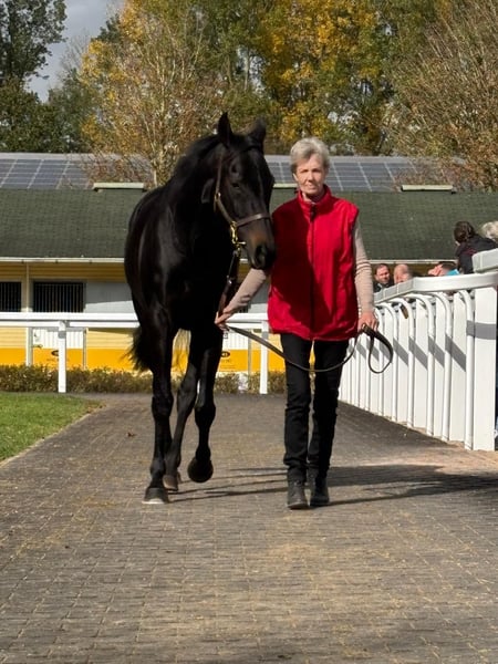 Albany is a very harmonious, nearly black English Thoroughbred mare. She has achieved two wins and placed eight times during her racing career. Due to a tendon injury, she was retired this season and has been at stud since then. She is sound in walk and trot, is exercised daily in a lunging session, and is turned out in a herd.