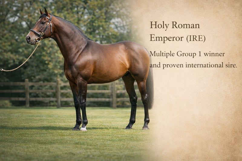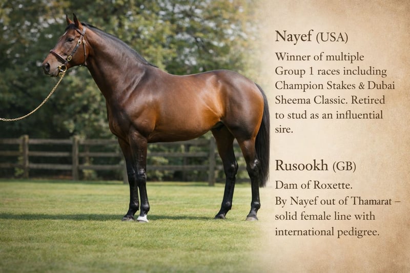 Charakter (interior) Jasna, wyrazista klacz z wyraźnie zaznaczonym charakterem i wyraźnymi granicami. W stajni nie jest towarzyska dla każdego: musi najpierw poznać swojego opiekuna, a wobec obcych może być zdystansowana lub ostro reagować. Pod opieką stałych ludzi jest bardzo posłuszna. W pracy jest wyjątkowo chętna do pracy i myśląca, łatwo przyswaja trening na lonży. Wymaga dużo ruchu, regularności i konsekwentnego, doświadczonego opiekuna. Wygląd zewnętrzny (budowa, oznaczenia) Koniec angielski pełnej krwi (xx) z wyraźnym sportowym wyrazem i atletycznym sylwetką. Poprawne, suche nogi oraz lekki, zwrotny sposób poruszania się. Kolor/ozdoby: kasztanowata, oznaczenia / whorls (wirki): podwójny wir na grzbiecie szyi po obu stronach (double whorl upper third crest both sides). Piórkowy wir na połowie długości tchawicy (feathered whorl mid trachea). Dodatkowo po obu stronach pod pachami występują wirki (bilateral axillae whorl). Głowa: podwójny wir centralnie nad wysokością oka (double whorl about median above eye level). Po prawej stronie wir w obrębie małej gwiazdy (right whorl contained within a small star). Kolor/pozostałe widoczne oznaczenia: mała biała plama nad oczami. Dodatkowe cechy Bardzo spokojna podczas załadunku na przyczepę; załadunek i transport bez problemu. Dobrze radzi sobie w treningu na lonży i w pracy na ziemi. Wydajny i energiczny typ, który korzysta z codziennego ruchu i stałej rutyny. Szczególne informacje o koniu Była koniem wyścigowym. W wieku 2 lat doznała kontuzji kolana podczas kariery wyścigowej; po leczeniu ponownie osiągała zwycięstwa i miejsca na podium jako 4-latka. Nie była trenowana pod siodłem, wykonywała prace na ziemi — wymaga ponownego rozpoczęcia treningu pod siodłem. Oferowana jako klacz reprodukcyjna z silnym, międzynarodowym rodowodem. Rodowód: Holy Roman Emperor (Danehill x L’On Vite) x Rusookh (Nayef x Thamarat by Anabaa).