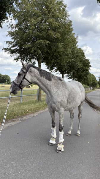 With a heavy heart, I am offering my 8-year-old Thoroughbred mare, Monta Rare, for sale. Unfortunately, we have not been able to find a common riding rhythm over the past four years. Please note: She will not be sold to dealers or riding schools. She is a Thoroughbred racehorse, so she is very energetic and spirited. Monta is an English Thoroughbred, born in 2017, standing approximately 16.1 hh. She is naturally a somewhat nervous type of horse. Therefore, she needs a rider with a gentle touch but also confident leadership and consistency. She is very willing in the outdoor arena and on cross-country, whether alone or in a group, but she prefers to be quite forward. She knows the indoor arena and the riding paddock but prefers outdoor riding. Show jumping is definitely her forte, although she has not been extensively trained in it. I also see her great potential in eventing, as she is very fearless over jumps. Overall, her background as a racehorse has left her with a few quirks: she sometimes overreacts to leg aids and tends to want to move ahead quickly, but these are trainable with patience. She works very willingly and learns quickly. She is not a kicker or difficult in handling. • No turnout in winter; currently stabled with daily turnout to pasture or paddock within a herd • In May 2025, she suffered laminitis due to incorrect hoof care; since then, she has been shod in front • Blood test in April 2025 revealed a selenium deficiency, which is now being supplemented • Farrier and veterinarian visits are no problem • Loading is not her favorite, but she stands very calmly during transport Sold with all accessories, many of which are new (jump saddle, bridle, blankets, halter, etc.). To prevent trial riding for commercial purposes, I will charge €20 for a test ride, which will be deducted from the purchase price. Serious buyers are welcome to multiple test rides free of charge, by arrangement. Priority for me is that she finds a good new home.