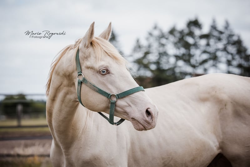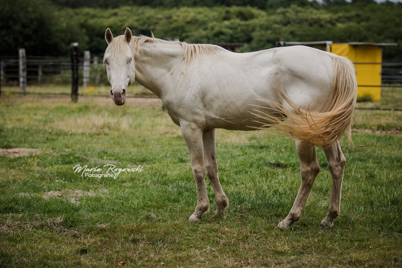 Caballo de pura raza inglesa en Smoky Cream (doble dilución) | nacido en 2010 | 1,60 m | caña 22 cm Inscrito en el Studbook de la Asociación de Cría de Pura Raza Inglesa de Alemania (2011) Reconocido por ECHA-ESV (2012), EASP Países Bajos (2015), ANAA / IFCE Francia (2017/2022), AES (2020), France Galop (2024), Zangersheide Genética: E/e a/a Cr/Cr Testado para WFFS, CA, SCID, PSSM2 – negativo El TCF Palladium xx fue el primer pura raza inglesa Smoky-Cream nacido en el mundo. Proviene de la True Colours Farm en Canadá (cría: Guaranteed Gold xx x yegua de Red Fox Farm) y fue importado a Alemania en 2011. En 2012, obtuvo su primera reconocimiento en la categoría de sementales del Libro I con una nota de tipo de 9,0. Destaca por su estructura correcta, un físico equilibrado y su carácter confiable. Debido a su particularidad genética, es ideal para potenciar líneas de caballos de sangre caliente y de cría mixta, especialmente en la cría de color. Su descendencia está presente en diversos programas de cría en Europa, mostrando un aspecto moderno, armonioso y colorido. Tras un accidente que le causó lesiones en las patas delanteras, Palladium ya no puede trotar con claridad. Sin embargo, no siente dolor y sigue moviéndose con gusto. No hay impedimentos para su uso en la reproducción.