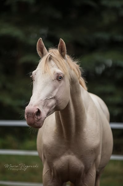 Englisches Vollblut in Smoky Cream (double dilute) | geb. 2010 | 160 cm | Röhrbein 22 cm Eingetragen im Direktorium für Vollblutzucht Deutschland (2011) Anerkannt bei ECHA-ESV (2012), EASP Niederlande (2015), ANAA / IFCE Frankreich (2017/2022), AES (2020), France Galop (2024), Zangersheide Genetik: E/e a/a Cr/Cr Getestet: WFFS, CA, SCID, PSSM2 - negativ TCF Palladium xx war der erste jemals geborene Smoky-Cream-Vollblüter weltweit. Er stammt aus der True Colours Farm in Kanada (Zucht: Guaranteed Gold xx x Red Fox Farm-Stute) und wurde 2011 nach Deutschland importiert. 2012 folgte die erste Anerkennung im Hengstbuch I mit einer Typnote von 9,0. Er überzeugt durch korrektes Fundament, ein ausgewogenes Exterieur und seinen zuverlässigen Charakter. Aufgrund seiner genetischen Besonderheit eignet er sich hervorragend für die Veredlung von Warmblut- und Partbred-Linien, insbesondere in der Farbzucht. Seine Nachzucht ist europaweit in unterschiedlichen Zuchtprogrammen vertreten und zeigt sich modern, harmonisch und farbsicher. Nach einem Unfall mit Verletzungen der Vorderbeine ist läuft Palladium im Trab nicht mehr klar. Er ist aber schmerzfrei und bewegt sich weiterhin gerne. Einem züchterischen Einsatz steht nichts im Weg.