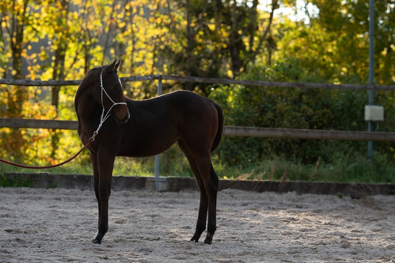 Na sprzedaż oferowany jest ten ogier urodzony w kwietniu 2025 roku. Noble Flame, pełnej krwi angielskiej, jest wyjątkowym źrebięciem. Trudno go wyprowadzić z równowagi. Już podczas pierwszych ćwiczeń z podstawowego szkolenia źrebiąt pozytywnie mnie zaskoczył. Prowadzenie, zapinanie na uwięzi, czyszczenie, podkuwanie kopyt, a nawet załadunek – wszystko przychodzi mu z łatwością. Noble Flame pochodzi od Amaron (Stado Etzean). Dotychczasowe potomstwo odnosi sukcesy na torze wyścigowym, osiągając wysokie wyniki aż do grupy 3. Wszyscy wykazują zdrową ambicję i chętnie uczestniczą w sportowych aktywnościach. To również pasuje do Noble Flame, który chętnie poznaje wszystko z ciekawością, pozostając przy tym aktywny, ale uprzejmy. Matka Noble Flame, Noble Rose, sama miała tylko dwa krótkie starty wyścigowe, zanim została wykorzystana w hodowli. Jej pierwsze źrebięcie dwukrotnie wygrało w Anglii, trzecie również odniosło zwycięstwo. Uważam jednak, że linia rodzinna Noble Rose jest znacznie ciekawsza, jeśli spojrzymy na cechy charakteru. Noble Rose jest jak skała w burzy – jej spokój, cierpliwość i opanowanie czynią z tego pełnej krwi angielskiej wyjątkowe zwierzę. Noble Flame z pewnością odziedziczył te cechy. Dobrze wyobrażam sobie, że może znaleźć swoje miejsce w jeździectwie wszechstronnym lub skokach przez przeszkody – nie musi to być koniecznie sport wyścigowy. Jeśli jesteś zainteresowany Noble Flame’em, napisz do mnie wiadomość lub zadzwoń. Będę się cieszyć, jeśli trafi w kochające ręce!