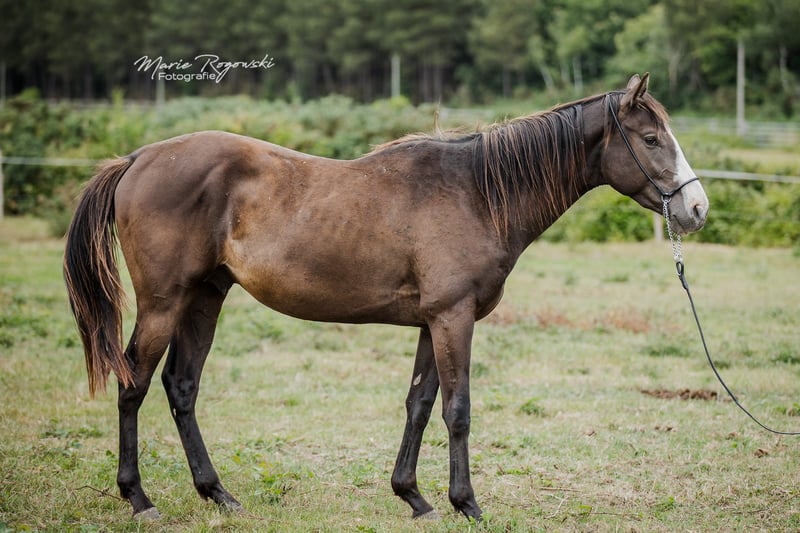 Angielski pełnej krwi w Smoky Black (nosiciel prostego kremu + nosiciel Overo) | ur. 2022 | aktualnie w fazie wzrostu Angielski pełnej krwi Genetyka: E/_ a/a Cr/n OWL/n STUNED AGAIN XX to młody ogier pełnej krwi o rzadkiej genetyce kolorystycznej i przyjaznym usposobieniu. Jest uważny, spokojnie zainteresowany i chętnie podchodzi do ludzi, nie będąc natarczywym. Ogólnie rzecz biorąc, to bezproblemowy, ciekawski młody ogier. Dorasta w grupie młodych ogierów w różnym wieku, zna regularny kontakt z ludźmi i jest zaznajomiony z podstawowymi codziennymi czynnościami – w tym prowadzeniem, załadunkiem, czyszczeniem i pielęgnacją kopyt bez podków. Ojciec: T.C.F. Palladium xx – jeden z nielicznych na świecie smoky cream pełnej krwi, hodowany w Kanadzie (True Colours Farm), aktywnie uczestniczący w hodowli kolorystycznej. Matka: Just Stunning xx – angielska klacz pełnej krwi z nosicielskim statusem Overo (OWL/n)