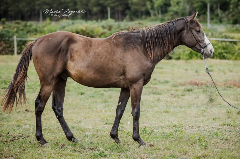 Puledro Purosangue Inglese in Smoky Black (portatore di crema semplice + portatore di Overo) | nato nel 2022 | attualmente in crescita Purosangue Inglese Genetica: E/_ a/a Cr/n OWL/n STUNED AGAIN XX è un giovane stallone purosangue con una genetica di colore rara e un carattere amichevole. Si mostra attento, tranquillo e interessato, avvicinandosi volentieri alle persone senza essere invadente. In generale, è un puledro maschio curioso e facile da gestire. Cresce in un gruppo di puledri maschi di età mista, ha contatti regolari con le persone ed è familiare con le procedure quotidiane di base, tra cui conduzione, carico, pulizia e cura degli zoccoli non ferrati. Padre: T.C.F. Palladium xx – uno dei pochi purosangue smoky cream al mondo, allevato in Canada (True Colours Farm), attivo da noi nella selezione dei colori. Madre: Just Stunning xx – fattrice purosangue inglese con status di portatrice di disegno Overo (OWL/n)