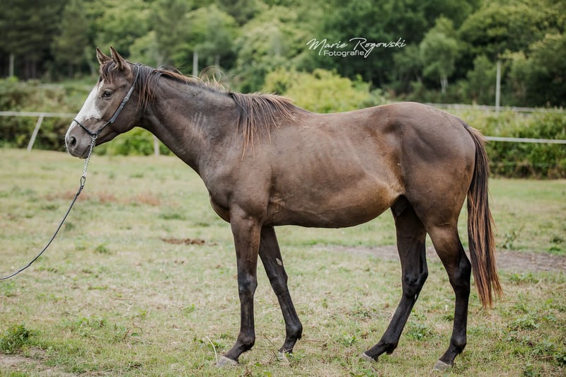 Thoroughbred in Smoky Black (single cream carrier + overo carrier) | born 2022 | currently growing Genetics: E/_ a/a Cr/n OWL/n STUNED AGAIN XX is a young thoroughbred stallion with rare color genetics and a friendly nature. He is attentive, calmly interested and likes to approach people without being pushy. All in all, he is an uncomplicated, curious young stallion. He is growing up in a mixed-age group of young stallions, has regular contact with people and is familiar with basic everyday procedures - including leading, loading, grooming and hoof care. Sire: T.C.F. Palladium xx - one of the few smoky cream thoroughbreds in the world, bred in Canada (True Colours Farm), active in color breeding with us. Dam: Just Stunning xx - English Thoroughbred mare with Overo draft carrier status (OWL/n)