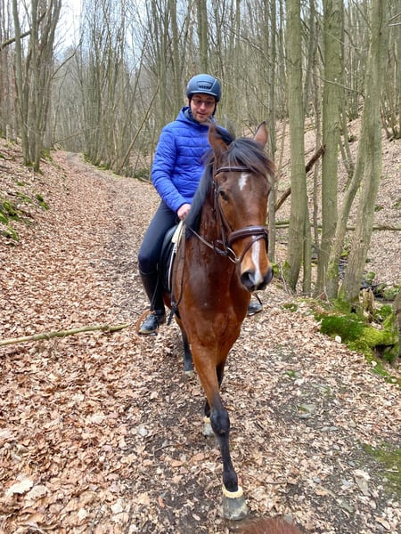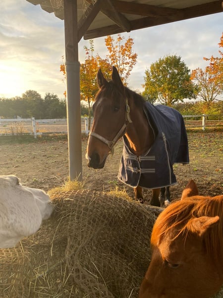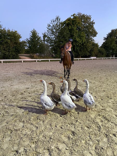 Nuttoridge – Hongre de pur sang, 10 ans, 172 cm – partenaire attachant avec du tempérament Prix : 7 500 € négociable – priorité à la place ! En raison d'une réduction de notre cheptel, nous recherchons pour notre hongre de pur sang de 10 ans, Nuttoridge (taille environ 172 cm), un nouveau foyer adéquat. C'est un ancien cheval de course qui a ensuite été solidement entraîné. Caractère & Manipulation : Au quotidien, c'est un véritable trésor – affectueux, sociable et absolument sans complications. Il a un cœur en or et ferait tout pour son humain une fois qu'il a établi sa confiance. Il peut être manipulé sans problème par des enfants, est ferré uniquement devant et se montre très amical à la ferme. Dans le troupeau, il est très sociable. Particularités : Il a plutôt tendance à être difficile à engraisser, mais s'en sort bien avec une alimentation appropriée. Actuellement, il est seulement ferré devant. Il n'a aucun vice tel que le bucking ou le lever de tête. Montée & Éducation : Sous la selle, il est sage, plein de tempérament et très résistant nerveusement. Il reste calme et gérable même dans des situations inhabituelles – que ce soit monter sous les projecteurs dans l'obscurité, pendant qu'une tente flottante est montée, lorsque la bride se casse au galop ou que des moutons sautent soudainement sur la carrière. (Tout cela s'est déjà produit.) Cependant, il a besoin d'une personne de référence stable lorsqu'il est monté, avec qui il peut établir une confiance. Il n'est donc pas adapté aux débutants, aux cavaliers anxieux ou aux cavaliers revenant à l'équitation. • Saut : sûr dans les parcours E • Dressage : environ au niveau E, mais est actuellement en cours de rééducation lente en raison du manque de cavalier • Extérieur : s'aventure bien en extérieur, mais devient rapidement excité en groupe Place souhaitée : La personne adéquate est plus importante pour nous qu'une décision rapide. Nous souhaitons des cavaliers expérimentés avec une aide calme et claire et un plaisir à avoir un partenaire sensible et désireux d'apprendre. Pour un intérêt sérieux, nous serions ravis de recevoir un message ! Des vidéos sont disponibles sur demande.