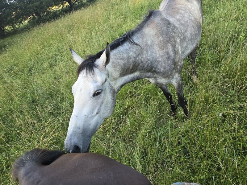 6 yr old steel grey ottb. Gelding. 15.2- 3. Just under 16h. W/t/c English and western. Great on trails, green but willing. Located in berryville / clearbrook va. Cons: both fonts were damaged from track. One bowed and the other with screws- doesn't bother. Came off track and with me nov. Still working on building up tendon, light riding only until fully healed. Cribs when stalled. Pros: great in mixed field. Great sharing food. Good for feet. Good for grooming and tacking. Good for everything... not a fan a water. Not neck reined trained, just good ole pull left pull right plow.