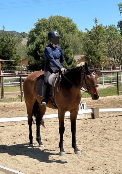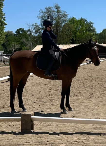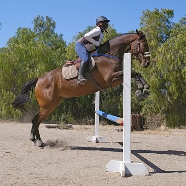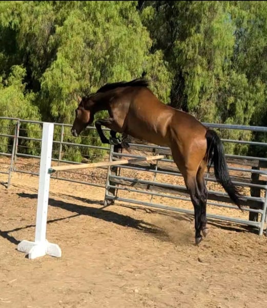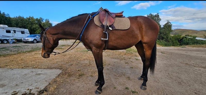 Suna est un hongre pur-sang bai de 7 ans. Il mesure environ 1,73 m au garrot. Il n'est actuellement pas monté, mais il l'a été par le passé. Je l'ai récupéré à 3 ans sur le circuit comme projet et j'ai travaillé avec lui pendant 4 ans, mais malheureusement, c'est trop de cheval pour moi. Je ne peux pas lui consacrer le temps et l'attention qu'il mérite. Il a un niveau de dressage de base et a sauté à la maison jusqu'à 80 cm (2'6) et a sauté librement jusqu'à 120 cm (4 pieds). Ce serait un cheval de concours complet incroyable avec la bonne personne et le bon entraînement. Il sortait souvent en randonnées et était monté dans des espaces ouverts. Il s'entend bien dans un groupe et a vécu la majeure partie de sa vie dans un pré avec 3 autres chevaux. Il a toujours eu un problème avec le transport en van. Nous avons travaillé là-dessus, et il s'est amélioré, mais il n'est définitivement pas à 100 %. Il a encore ses moments de panique dans le van. C'est définitivement un cheval plein d'énergie et il aurait besoin de quelqu'un prêt à s'investir dans un projet. Je ne me dérange pas qu'il aille dans un foyer où il n'est pas utilisé pour la monte, tant qu'il va dans un bon foyer aimant.