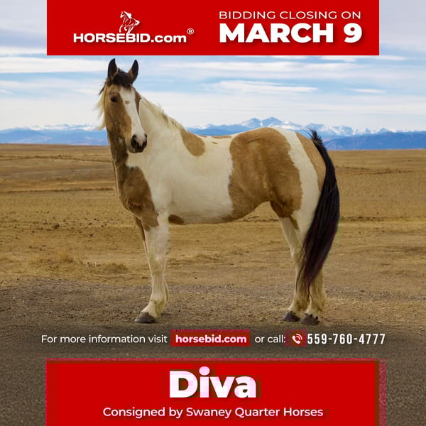 ℳ𝒶𝓇𝒸𝒽 ♦️𝐑𝐈𝐃𝐄𝐑'𝐒 𝐂𝐇𝐎𝐈𝐂𝐄♦️ Happening now thru MONDAY | MARCH 9th - Available EXCLUSIVELY on HorseBid's website! For more details and to register visit: www.Horsebid.com CONSIGNOR CONTACT: Swaney Quarter Horses 559-760-4777 LOCATION: Fort Collins, CO BREED: Spotted Draft/ Saddlebred REGISTERED: Yes REGISTERED NAME: El Dorados Charmed I’m Sure COLOR: Buckskin and white HEIGHT: 16.1 AGE: 10 GENDER: Mare Introducing Diva❤️ If you are looking for an exceptional long term partner check Diva out. This mare has been apart of our family for the past 2 years and has not been passed around. We have used her for everything under the sun. Backcountry trails, trails through the city, english, western, kids lessons, jumping, and we have even hooked her up and ground driven her. She has a great mind and is always up for trying new things. She is the SWEETEST mare too, comes and searches you out in the pasture for love and scratches. The kids catch her unassisted. Not mareish. In a herd and lower on the totem pole. She also stalls well and is good being hauled to new places. Diva is an exceptional mover and could even be a hack winner in a short stirrup class. She is classy and careful with where she puts her feet. She has been started over fences and small courses. She has more whoa than go but is finished at all gaits and the kids have no problems making her trot and lope. She collects well, is soft in the face, and moves off leg. Diva will lead or follow on a trail and crosses whatever you ask her to. She is no stranger to water crossings, bicycles, bridges, will cross down trees and logs, traffic safe, not afraid of air brakes and loud trailers, and has been ridden down the busiest road in Fort Collins without a hitch. She is great with time off and has no vices. No lunging required. She rides off the same in the cold, wind, snow etc. She is good for the vet and farrier, currently barefoot but has been shod before. No health issues. She is an easy keeper and requires no maintenance currently. She is UTD on farrier work, dental work, vaccines, wormer, was just sand cleared last month, has a current coggins, and an UTD soundness/ health exam. Come meet this sweet girl. Someone is going to have a really special forever partner. We know she will be such a great addition to someone’s family and we are going to miss her terribly.