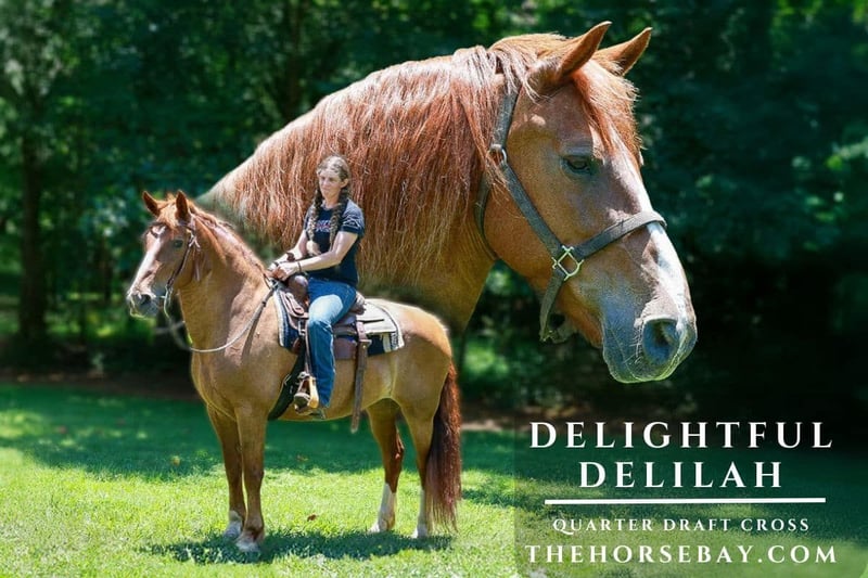 2 Week Guarantee Check out DELIGHTFUL DELILAH… 15.2h of pure BEAUTY 12-year-old, Draftcross Mare Trail rider deluxe!!!! Nothing too deep or steep Logs, water, ditches, etc….. doesn’t matter Extremely traffic safe(watch vids) Wildlife and dog safe Rides and drives Excelled in mounted patrol training Utd on everything and great manners Honest and is the same ride every day, every time, no matter the time off Has also been a wonderful mom and raised a gorgeous baby Friendly as a dog, and is fun for the whole family to enjoy Easy keeper and great feet Built for a heavier rider, but will work for any rider Beginner/confidence booster type horse One ride and she’ll be your go-to gal!!!