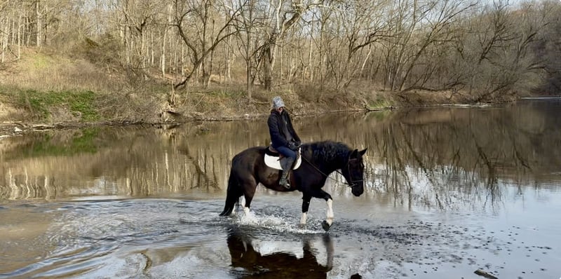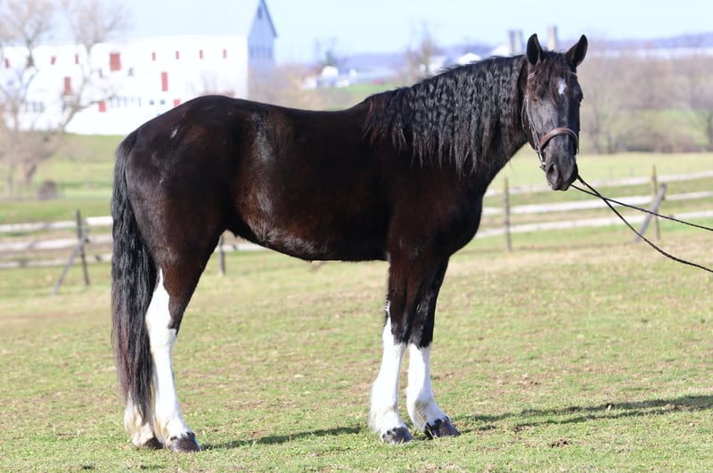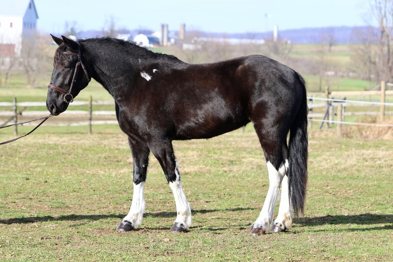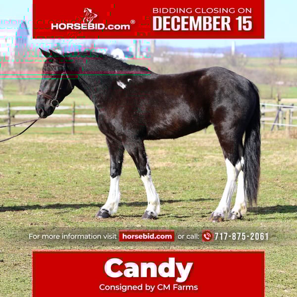 🎄𝐓𝐇𝐄 𝑯𝒐𝒍𝒊𝒅𝒂𝒚 𝐂𝐋𝐀𝐒𝐒𝐈𝐂🎄 Happening now thru MONDAY | DECEMBER 15th - Available EXCLUSIVELY on HorseBid's website! For more details and to register visit: www.Horsebid.com CONSIGNOR CONTACT: CM Farms 717-875-2061 LOCATION: Gap, PA BREED: Gypsy Vanner/Spotted Draft X REGISTERED: No REGISTERED NAME: Candy COLOR: B/W HEIGHT: 15-15.1 AGE: 3 GENDER: Mare How cute is this girl! Meet ✨Candy!✨ (Sibling to Hershey)☺️ This pretty mare is a 3-year-old, 15–15.1hh Gypsy Vanner/Spotted Draft X. This pair is some of the nicest-looking 3-year-olds we’ve come across—already so nicely filled out and round! Candy was simply born quiet with a good brain. She’s been a pleasure to have in the barn; easy, simple, and one we can look forward to working with! She’s broke to ride English, Western, bareback, and drives both single and double! 💕 Under harness, Candy acts like she has 30 years of experience and miles under her belt. In reality, she is just blessed with being so easy, quiet, and intelligent. She could really pass for a pro! She stands to hitch and works well in a team or alone. She’s steady and unflappable, responding with only a light rein and voice cues. She and her brother, Hershey, just make the cutest pair! We’d love to see them go together as they work so well. A good matched team like them is hard to find, however, we are being realistic and offering them separately. Hitched up alone, Candy keeps her steady, unwavering demeanor and always looks to please. On the trail, Candy is happy to be out—always with ears forward and a curiosity about her. She’ll pack anyone on the trail and tends to mosey along in the back with her slow, quiet demeanor. She will lead without hesitation if she’s put in the front, and she’s not one to mind if another horse rides too close or gets in her space. She is very non-marish toward other horses and gets along with everyone both under saddle and in the pasture. She’s a good trail blazer with a careful step and a willing attitude. She’d make a great husband horse! She’ll go through the woods, through the open fields, or really anywhere you point her. She’s seen bikers, hikers, dogs, traffic, and wildlife on the trail, and she takes everything in stride without batting an eye. She’ll go right into the river and crosses the creeks. This girl genuinely enjoys being out and is one of the most unbothered, nonchalant three-year-olds we’ve ever encountered! We think she’d thrive with a trail job and would be so fun to paper chase or fox hunt with. There aren’t many three-year-olds we trust like her. We've even ridden into town over busy highways with semi trucks going by her—and she was a saint! Unflappable and steady. No questions asked. Under saddle in the arena, Candy is straightforward while learning the basics. She’s a complete push ride—one you can have all the leg on, and even use a crop or spur if needed. She wants to be slow and steady, however, she will walk, trot, and canter both directions. She picks up both leads easily! Candy is naturally a plug, but will get up and go with some encouragement. She has easy transitions and good brakes. This girl stands to mount, walks and trots over poles, and has even popped over a cross-rail with the cutest knees! We have no doubt she’ll be athletic and a fun one to jump once she matures more and develops a stronger work ethic. She’s comfortable to sit trot and to canter. Her pretty stockings and cute movement give her all the flash in the arena, and she gets noticed everywhere she goes! This mare is the same horse on property as she is off, and she’d be safe and quiet enough for an AA or JR rider to continue bringing along. 🙌🏼 In the barn, Candy wants to be your best friend and loves attention. She stands to be brushed, tacked up, braided—and she even likes to dress up for the holidays! 😍 She’s well-behaved for the farrier and vet and picks up all four feet easily. She has zero vices in the stall or turnout. She is a young horse who sometimes still needs reminders about ground manners and personal space—but only because she would live in your pocket if she could! She’s been desensitized to just about everything and is never one to give a big reaction or lose her head- (generally she tried to taste test new things instead).😆 She naturally has a curious, calm demeanor. She’s stolen our hearts with her quiet, sweet nature and will make somebody the best of friends! Don’t miss out on a chance to own this fantastic little lady. UTD on shots, farrier, dentist, coggins, and deworming.