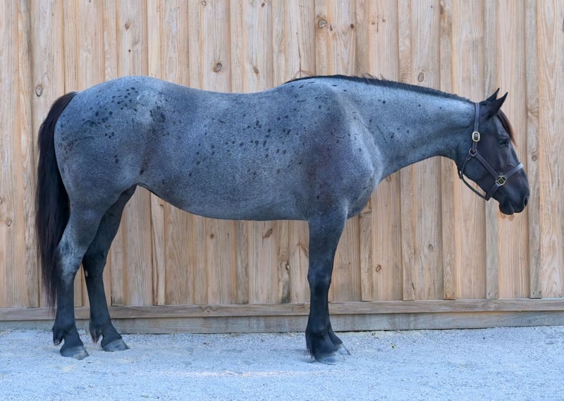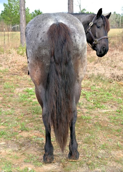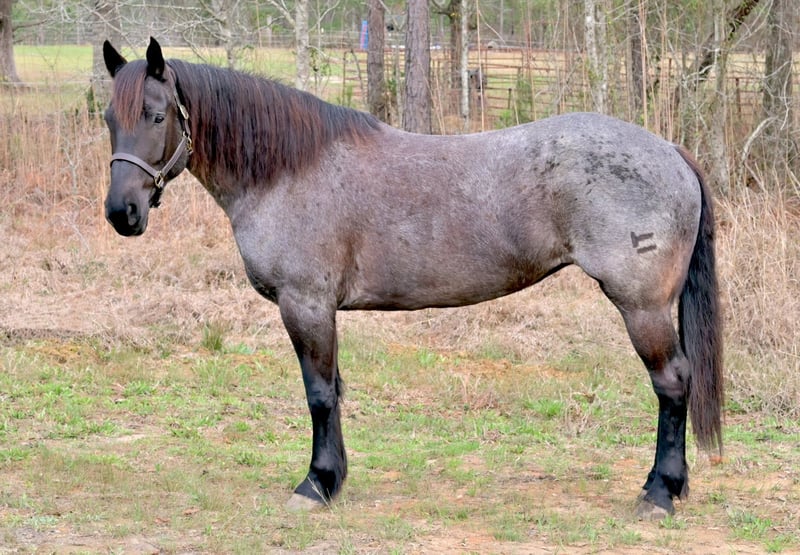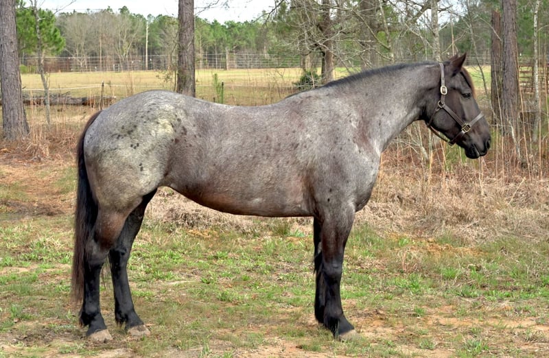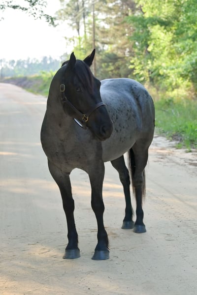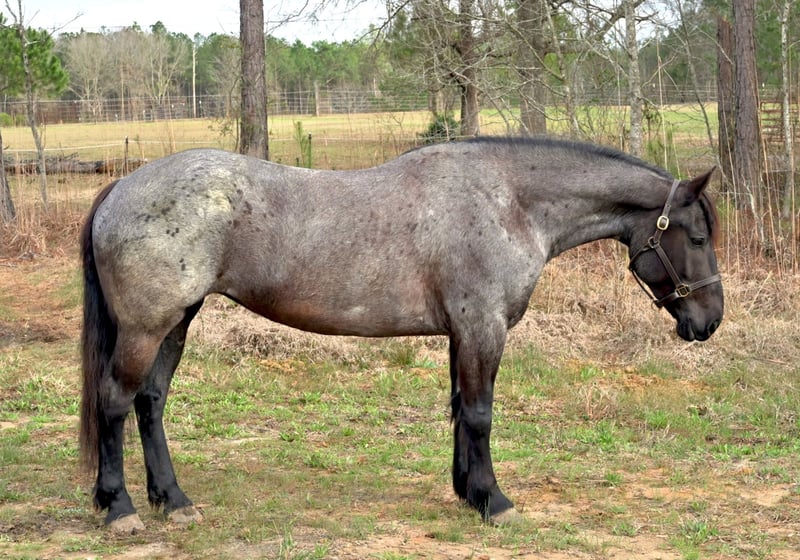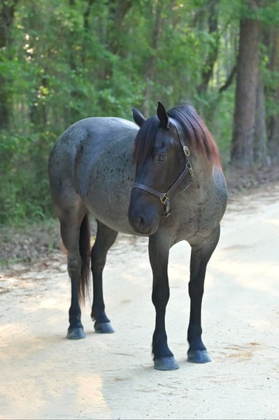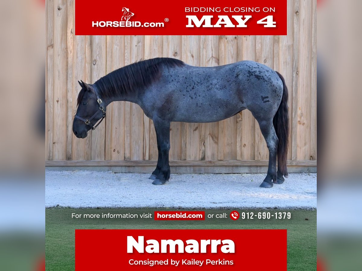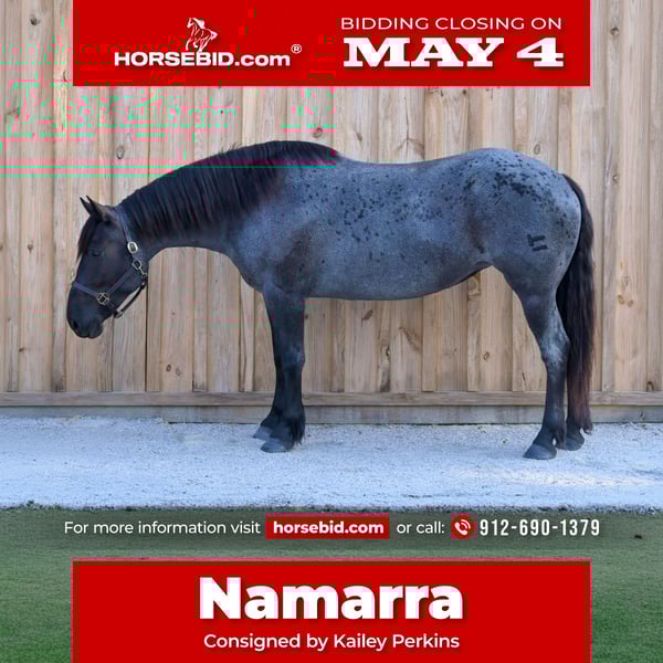 ▪️▫️◾️𝐭𝐡𝐞 𝑴𝒂𝒚 𝐒𝐞𝐥𝐞𝐜𝐭◾️▫️▪️ Happening now thru MONDAY | MAY 4th - Available EXCLUSIVELY on HorseBid's website! For more details and to register visit: www.Horsebid.com CONSIGNOR CONTACT: Kailey Perkins 912-690-1379 LOCATION: Adrian, GA BREED: Draft Cross (Quarter Horse x Clydesdale) REGISTERED: Yes REGISTERED NAME: Frosted Indigo COLOR: Blue Roan HEIGHT: 15.3 AGE: 4 GENDER: Mare Beauty, brains, and papers! Namarra is a coming 5 year old, 15.3hh, blue roan mare, and is registered with the American Draft Cross Registry as "Frosted Indigo". (Quarter Horse x Clydesdale) Namarra is the same horse everyday - not mareish, not spooky, and can sit for weeks and ride off like she never missed a day. She knows vertical and lateral flexion, soft in the face, rides off your seat, has hip and shoulder control, backs easily, and knows her leads. Shes the easiest horse to catch, great to saddle, bridle, bathe, trailer, get her blanket on/off. She is great in a stall, and is very tidy! Namarra will pick you up off the mounting block if you que her to do so, drops her head and takes the bit by herself during bridleing, and will happily stand all day tied anywhere. Great for the Farrier, fly spray, clippers, dewormer, etc. Namarra has been trail rode plenty with groups and by herself. Shes happy to pop over jumps, drag logs or sleds, go through water, brush, cross ditches, and doesnt rush up or down hills. She is also very well desensitized to alot of things - plastic bags, tarps, stock whips - shes just fine with it all! Namarra has been Fox Hunting 2nd and 4th flight - she definitely enjoys the faster pace of the 2nd Flight, but she's also content to ride the slower pace of the 4th Flight. She is great with the hounds darting in and out of the woods, and other groups of horses coming by. Namarra also has experience as a pack horse - she spent 6 months packing in Illinoise. It definitely shows in her confidence on the Trail and her willingness to do whatever is asked of her! Outside of her riding experience and education, Namarra knows lots of groundwork, and is very broke in her body on the ground. She lunges wonderfully, knows how to yield her hips, forequarters, side pass away from you and towards you, roundpens, and knows several different backing exercises. To sum everything up, Namarra is just super easy to get along with, and is uncomplicated in every way. Her training, education, and life experiences makes owning and having a horse what it should be - fun and enjoyable! If you are wanting a gentle, easy to get along with, well trained, and sensible partner for your horse goals, then Namarra is your girl!