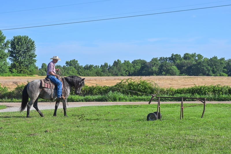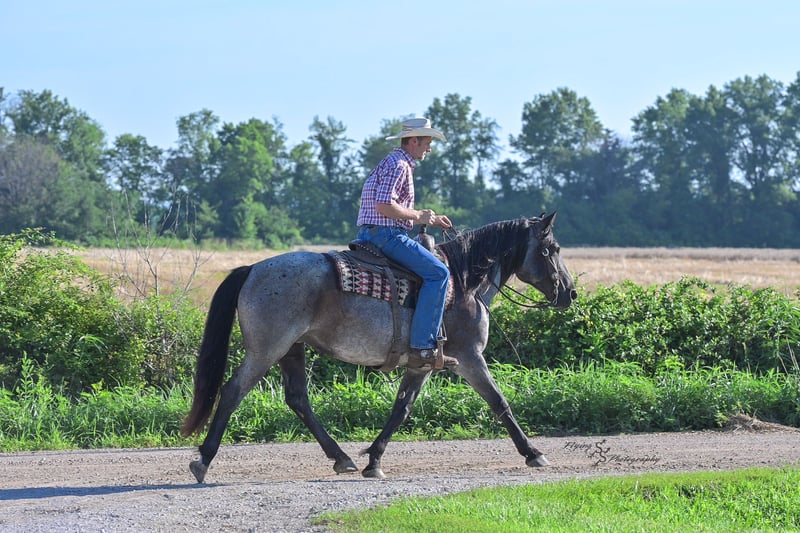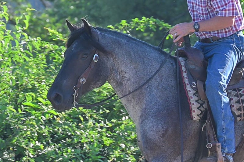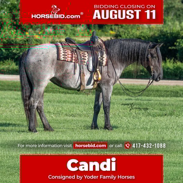 ⚜ The HERITAGE Classic ⚜ Happening now thru MONDAY | AUGUST 11th - Available EXCLUSIVELY on HorseBid's website! For more details and to register visit: www.Horsebid.com CONSIGNOR CONTACT: Yoder Family Horses 417-432-1088 LOCATION: Harwood, MO BREED: Draft Cross REGISTERED: No COLOR: Blue Roan HEIGHT: 15.1 AGE: 5 GENDER: Mare Wow! Here is a blue roan crossbred that checks all of the boxes. Candi is the perfect size at 15.1h. She is the right age, well broke, and is super quiet and gentle. This mare is special to us because she was born and raised on our farm. Candi was sired by our blue Percheron-Brabant draft stallion and out of our favorite quarter mare. She has always been, in your pocket, gentle from day one! Candi has been ridden lots and lots of miles on trails, on the road, and in the arena. She has been exposed to traffic, dogs, tarps, cattle, small livestock, and various trail obstacles. Candi always stays quiet and confident in challenging situations. She has also been used under harness on the farm and has no problem with that. Candi is eligible to be registered with the International Draft & Sport Horse Registry; we are happy to give you all of the information needed to have her registry completed. She sells 100% sound in every way. Candi has been ridden by kids and inexperienced riders, always taking the best care of her rider. For more information about Candi, or to schedule a time to meet her prior to the auction ending, please call us at 417-432-1088.