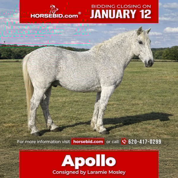 ♦️𝐍𝐄𝐖 𝐘𝐄𝐀𝐑'𝐒 𝑬𝒙𝒕𝒓𝒂𝒗𝒂𝒈𝒂𝒏𝒛𝒂♦️ Happening now thru MONDAY | JANUARY 12th - Available EXCLUSIVELY on HorseBid's website! For more details and to register visit: www.Horsebid.com CONSIGNOR CONTACT: Laramie Mosley 620-417-0299 LOCATION: Canyon TX BREED: Draft cross REGISTERED: No REGISTERED NAME: None COLOR: Grey HEIGHT: 15 AGE: 10 GENDER: Gelding Apollo is a super gentle draft cross gelding is as kind and honest as they come. He’s quiet, easy to handle, and truly suitable for any level of rider, from beginners to experienced riders looking for a safe, reliable mount. He is excellent on the trails—steady, confident, and unfazed by new scenery, traffic, wildlife, or rough terrain. He goes out alone or in a group, crosses water, handles hills, and takes care of his rider every step of the way. No rush, no drama—just a smooth, enjoyable ride. On the ground, he’s a gentleman with great manners: easy to catch, load, shoe, and groom. Under saddle, he’s forgiving, calm, and willing, making him an ideal choice for youth, adults, or anyone wanting a trustworthy partner. If you’re looking for a safe, gentle, all-around trail gelding with the size, strength, and disposition of a draft cross, this is the kind everyone searches for and rarely finds.