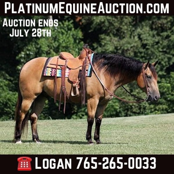 ONLINE AUCTION Place your bids at www.PlatinumEquineAuction.com Starting Bid $3500 Auction ends July 28th, 2024 Need a new saddle? Check out White Rock Saddles on our website or Facebook! Talk about a dreamhorse… Atlas is one of a kind! He checks all of the boxes, he has the color, the looks, the ride but most importantly he has the right mind! Atlas is a super stout built Golden Buckskin Gelding, standing around 15.1hh and he is 8 years old. Atlas has been used on a feedyard in Texas to around cattle, pasture roped and used to doctor as well. I have ridden down the highways, through subdivisions and he is safe around lawn mowers, all types of traffic and he is not spooky when dogs or kids come running out by the road. Atlas is great on trails and he will cross creeks, ditches, logs and navigate rough rocky areas. He is not scared of any wildlife that he meets and handles any situation that comes at him. He has a smooth jog, lopes around good and stops with ease. He is a gentle, laid back type of horse that is not in a hurry and he loves attention! Located in Level Green, KY. Feel free to call Moore Trained Horses Logan 765-265-0033 with any questions. ONLINE AUCTION Place your bids at www.PlatinumEquineAuction.com Starting Bid $3500 Auction ends July 28th, 2024 Need a new saddle? Check out White Rock Saddles on our website or Facebook!