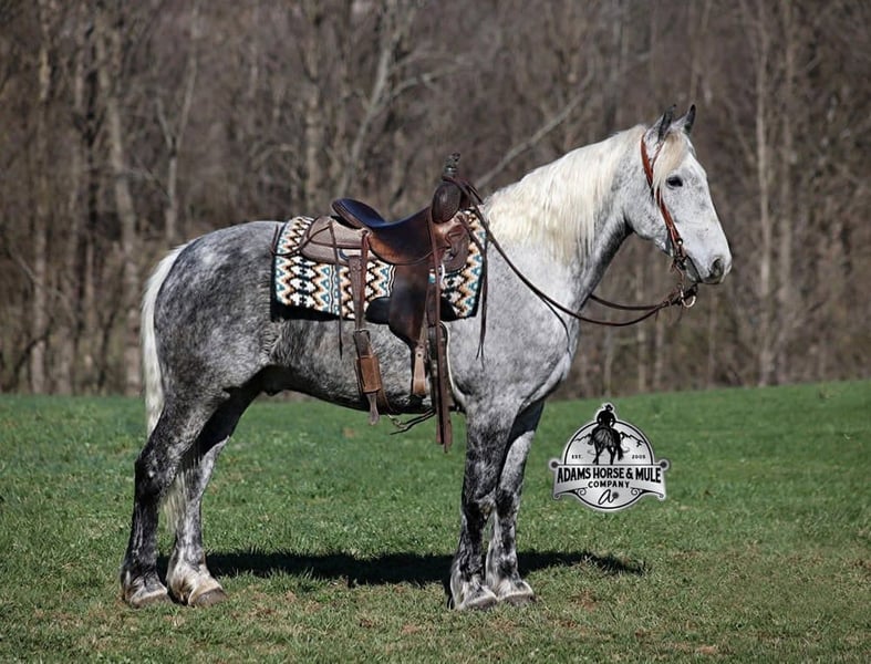 ▪️▫️◾️𝐭𝐡𝐞 𝑴𝒂𝒚 𝐒𝐞𝐥𝐞𝐜𝐭◾️▫️▪️ Happening now thru MONDAY | MAY 4th - Available EXCLUSIVELY on HorseBid's website! For more details and to register visit: www.Horsebid.com CONSIGNOR CONTACT: Adams Horse and Mule Company 606-308-2461 LOCATION: Mt. Vernon, KY BREED: Draft Cross REGISTERED: REGISTERED NAME: All Smoked Out COLOR: HEIGHT: 15.2 AGE: 10 GENDER: Gelding All Smoked Out has Dapples the size of apples! Just try to count the dapples on this guy! Smokey is a stout built draftcross gelding standing around 15.2hh, he will weigh 1250lbs, he is 10 years old, and he is that super pretty dapple grey coloring with a silver mane and tail! He is one cool looking guy! Not only does he look cool, he is has all of the other boxes checked as well… he is Mr. Personality, as friendly as they come, loves attention and is very calm natured. Smokey is out of the same breeding program as several other top draftcross geldings that we have had over the last 4 years and every one of them has the right mind with the calm nature that makes them great family horses. Smokey has been in our program since last year and has completed the natural horsemanship training and does liberty work and he also knows some tricks, he will bow, lay down and set on his rump. Smokey is great on trails and he will cross creeks, ditches, logs and navigate rough rocky areas. He has a smooth jog, a VERY VERY nice easy to set lope, a good stop, turns a circle both ways and backs with ease! He has been exposed to all kinds of wildlife such as deer or turkey or other animals like cows or dogs and will go anywhere that he is asked too. He has been rode many miles in the mountains of Eastern Kentucky and encountered every obstacle possible on the trail. He will go up or down even the steepest slopes, across deep creeks, over downed trees, and over all types of rough terrain while still being sure footed. Smokey is not cinchy, cold backed, does not crib or weave. In addition to riding, Smokey has also been driven down the highways as well. Smokey is a super cool horse that anyone is sure to love!!! Feel free to call Eric 606-308-2461 with any questions.
