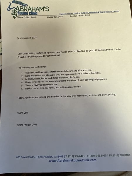 ONLINE AUCTION Place your bids at www.PlatinumEquineAuction.com Starting Bid $3500 Auction ends October 13th, 2024 Need a new saddle? Check out White Rock Saddles on our website or Facebook! Apollo’s size and build, at 16.2 hands and 1400 pounds, make him a solid and substantial horse, perfect for a wide range of activities while being gentle enough for even the youngest or most inexperienced riders. Apollo sounds like a dream horse—versatile, reliable, and steady! His ability to handle both English and Western disciplines, along with his experience in dressage, trail riding, and even parades, highlights his incredible adaptability. A Friesian Cross often brings the best of both worlds: the beauty, grace, and athleticism of the Friesian breed mixed with the resilience of other stock. His gentle temperament and calmness in any environment, even around loud and chaotic situations like parades or rodeos, would make him an ideal horse for a variety of riders, especially those who want a trustworthy, all-around family horse. The fact that he’s been used in lessons for children and teenagers and can confidently carry anyone from a child to a grandmother speaks volumes about his dependable and quiet nature. It’s also impressive that he’s traffic-safe and unfazed by heavy machinery or even freight trains! His low-maintenance care routine makes him a practical and enjoyable partner for just about anyone, regardless of their level of experience. Located in Lisbon, IA. Contact John McPhail 319-721-7714. ONLINE AUCTION Place your bids at www.PlatinumEquineAuction.com Starting Bid $3500 Auction ends October 13th, 2024 Need a new saddle? Check out White Rock Saddles on our website or Facebook!