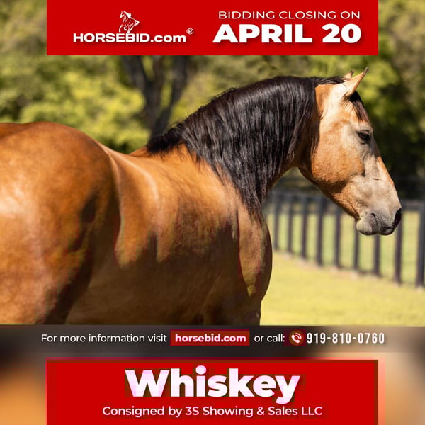⚜️𝐭𝐡𝐞 𝓔𝓵𝓲𝓽𝓮 𝐒𝐩𝐫𝐢𝐧𝐠 𝐂𝐥𝐚𝐬𝐬𝐢𝐜⚜️ Happening now thru MONDAY | APRIL 20th - Available EXCLUSIVELY on HorseBid's website! For more details and to register visit: www.Horsebid.com CONSIGNOR CONTACT: 3S Showing & Sales LLC 919-810-0760 LOCATION: Ocala, FL BREED: Draft cross REGISTERED: No REGISTERED NAME: Whiskey COLOR: Buckskin HEIGHT: 14.3 AGE: 4 GENDER: Gelding Whiskey Golden Dappled Buckskin Draft Cross Gelding with a tail that drags the ground. This 4 year old golden dappled buckskin gelding is wise far beyond his years. He stands 14.3 hands tall and has a solid, chunky build. With his long, flowing mane and tail that drag the ground, he is as striking as he is kind. Whiskey has been trail ridden from the mountain ranges of Colorado to the sandy beaches of Florida, and he takes every environment in stride with confidence and ease. Whiskey has been ridden down the road and into town. He is the type that makes every ride feel simple and enjoyable. Under saddle, Whiskey is a standout. He is a lovely mover with smooth, balanced gaits and quality flatwork. He has seamless transitions, easy leg yields, and is soft as butter in the bridle. He is ready to step right into a dressage test, yet just as happily carries a child through a weekend Pony Club outing. This past weekend, Whiskey stepped into the show ring and proved his quality—undefeated, winning the flat class out of a large group. His gaits are incredibly smooth and comfortable, making him a joy for riders of all levels. As fancy as he is, Whiskey is equally kind. He is your classic “giant teddy bear” and in your pocket. He is happy to ride bareback, quiet enough to handle a bullwhip, and willing to go gather cattle. He truly enjoys getting out on the trails and being part of whatever you ask of him. Whiskey has been cross country schooling and confidently jumps logs, gates, drop banks, and goes straight into the water. He has even completed the course with our 8 year old rider, showcasing just how forgiving and trustworthy he is. He has also successfully completed our full obstacle course with ease. In the barn, Whiskey is just as exceptional. He turns out well alone or with others, walks right up to you in the field, and genuinely loves attention. He is the type that forms a true partnership with his person. Whiskey is a true amateur dream—safe, fancy, and versatile enough to do it all. X-Rays on File.