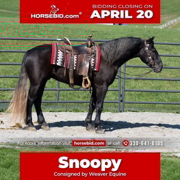 ⚜️𝐭𝐡𝐞 𝓔𝓵𝓲𝓽𝓮 𝐒𝐩𝐫𝐢𝐧𝐠 𝐂𝐥𝐚𝐬𝐬𝐢𝐜⚜️ Happening now thru MONDAY | APRIL 20th - Available EXCLUSIVELY on HorseBid's website! For more details and to register visit: www.Horsebid.com CONSIGNOR CONTACT: Weaver Equine 330-641-6105 LOCATION: Fredericksburg, OH BREED: Draft cross REGISTERED: No REGISTERED NAME: Snoopy COLOR: Gray HEIGHT: 15 AGE: 4 GENDER: Gelding Meet snoopy! Introducing a very pretty grey draft cross gelding that is very well broke to ride. He is great under both English and Western disciplines. He has been ridden in the arena, out on the trails, and Road ridden. He will lope a circle beautifully. Has a gorgeous walk, trot, canter transition. He will pick up both leads correctly. Stands at a mounting block. Snoopy sidepasses easily. He will stop and back up nicely when asked. He does not mind crossing obstacles and does it easily. He does not mind a tarp or flag. Snoopy is easy to handle and will do anything to please! When out on the trails he will happily take you through the hills. He will step over logs and cross Creeks easily. He will happily ride out alone, or in big groups. Snoopy is quite the gentleman in the barn as well. He is the first guy to greet you when you walk in! He is easy to catch, and easy to bridle. He will happily stand while you groom, tack, pick his feet etc. he will stand nicely for the farrier. He will ground tie nicely. He will stand well in cross ties too. He does not mind being bathed. He will Trailer load well. Snoopy is 100% sound and requires no maintenance. He is well-mannered and has a heart the size of Texas! If Snoopy sounds like a fit for you, please feel free to reach out with any further questions! We look forward to hearing from you! Contact Linda 330-641-6105
