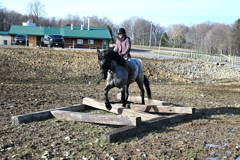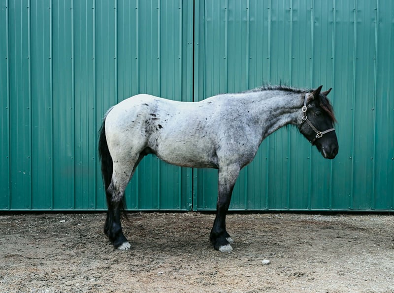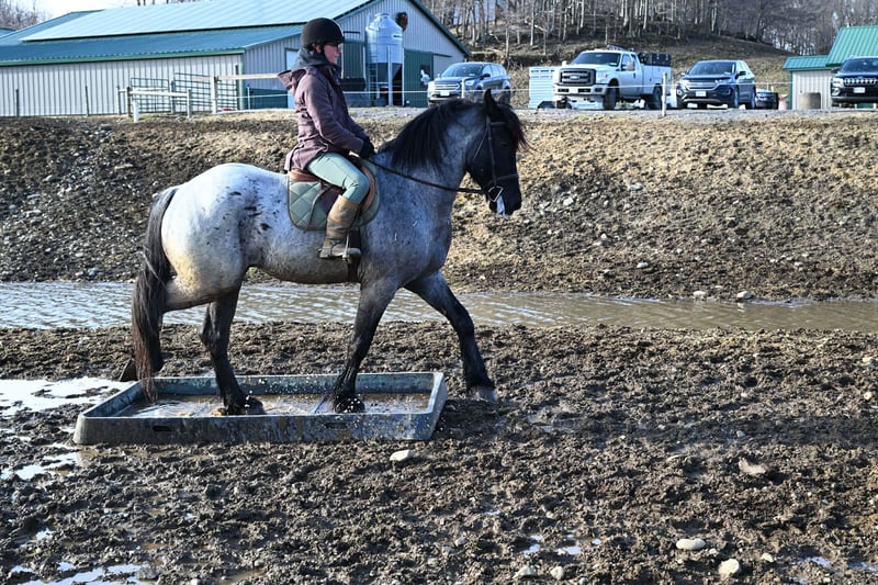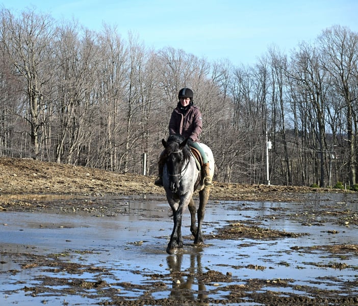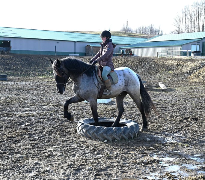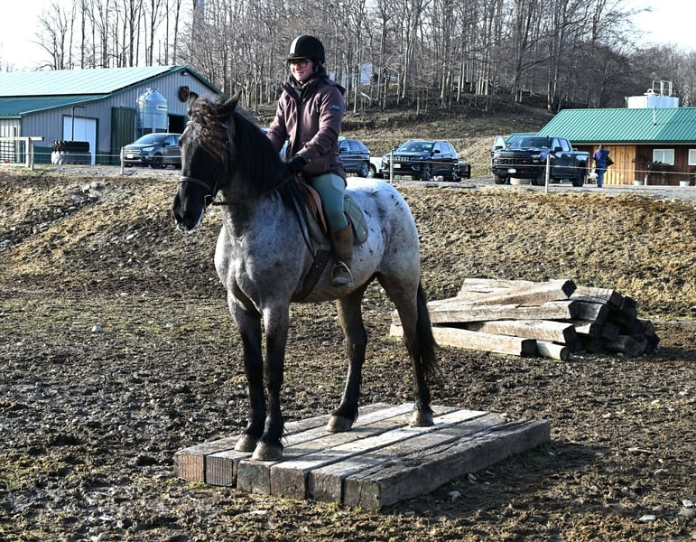 "AVAILABLE ON ONLINE HORSE AUCTION AT www DOT PlatinumEquineAuction DOT com BIDDING OPEN NOW thru SUNDAY | APRIL 12TH! *Final price will be determined on auction site* CONSIGNOR CONTACT INFO: Wolcott's Versatility Horses and Training 585-734-0169 LOCATION: Warsaw, NY **2 Week Guarantee** Meet Azur, a sharp-looking 4-year-old blue roan draft cross gelding standing 16.1h. He’s the kind that turns heads, but more importantly, he’s got the brain to match. Azur is sure-footed, brave, and takes everything in stride. He’s currently wearing shoes due to our terrain, but he has good, solid feet and clean legs. We’ve had him out on the obstacle course, and nothing seems to bother him; he’ll carry a flag, drag a tarp, and step over or through whatever you point him at without hesitation. He’s been used out on the trails both alone and in a group, and goes wherever you ask without a fuss. Azur is the type that wants to please and shows up with a good attitude every ride. He’s also been around plenty of wildlife, water, dogs, and farm equipment, all part of his normal day. On the ground, he’s easy to be around with good manners. He stands well for grooming, tacking, the farrier, and loads and trailers quietly. He gets along well with other horses and respects fencing. Happy in a stall or out in the pasture. Under saddle, Azur is a solid, comfortable ride with a nice walk, trot, and canter. He rides in a snaffle, stays soft in the mouth, and is easy to get along with. Azur has been used for our therapeutic riding program, and the riders all love him. Azur has been out fox hunting and on a low level eventing course. He stands for mounting and dismounting and knows how to take a joke. He has been in the arena with 15 other horses and doesn’t get bothered by other horses going by him. We have also used Azur for our sleigh rides this winter as a team, and he did an excellent job. If you’re looking for a young horse with a great start, a level head, and the kind of attitude that’ll take him in any direction, Azur is one you won’t wanna miss. Follow us on Facebook and our Website! Contact Dayton at 585-734-0169 for more information, located in Warsaw, NY.