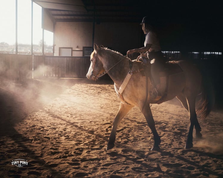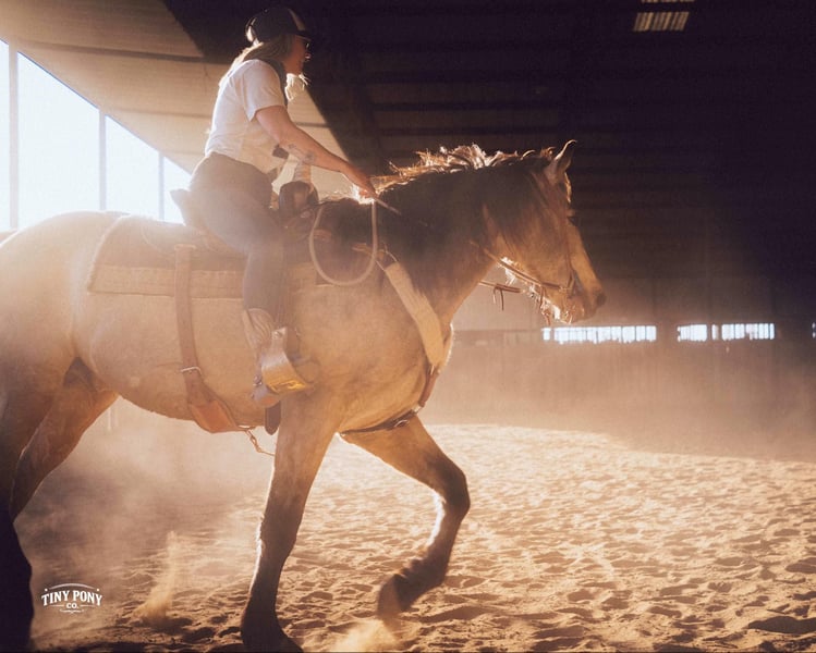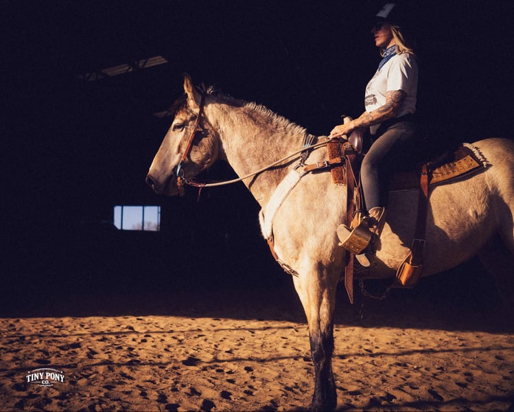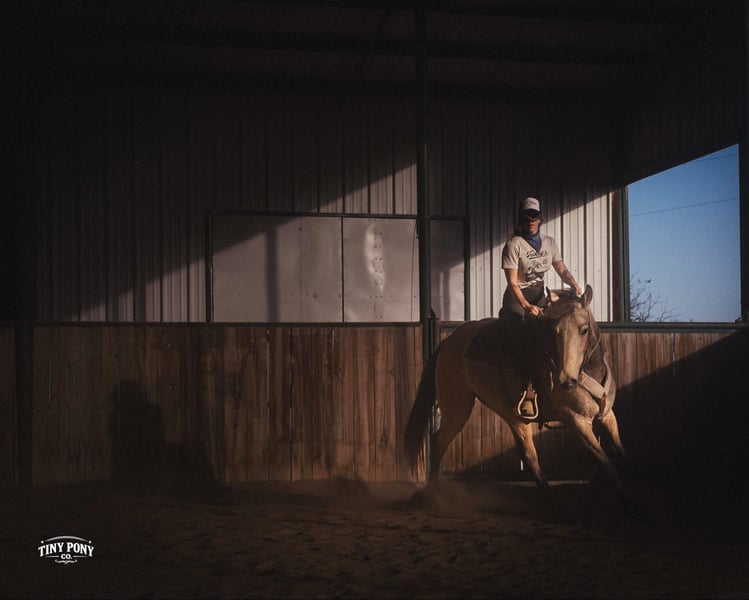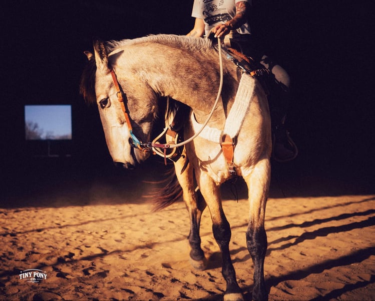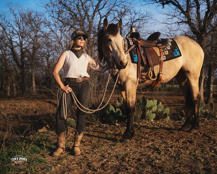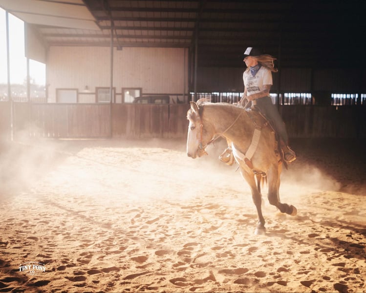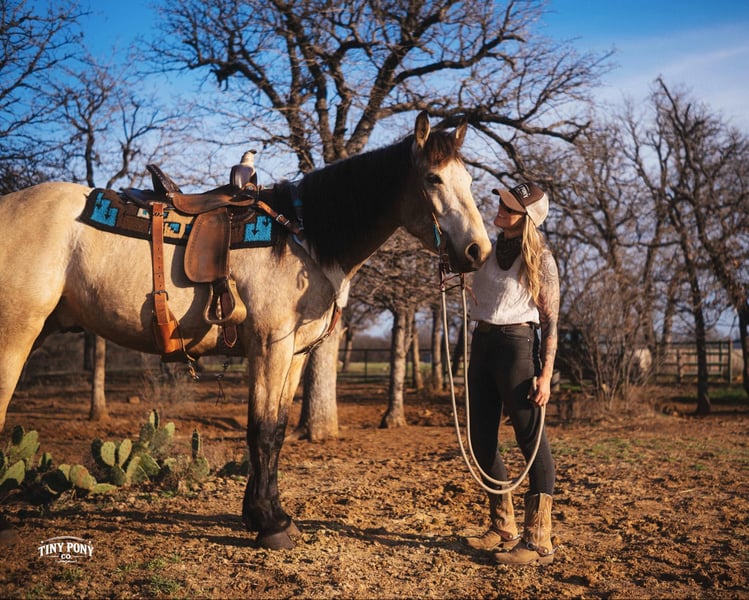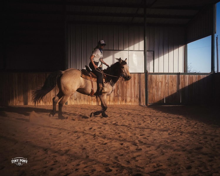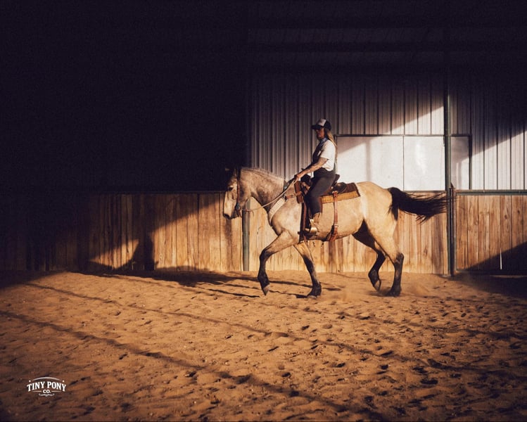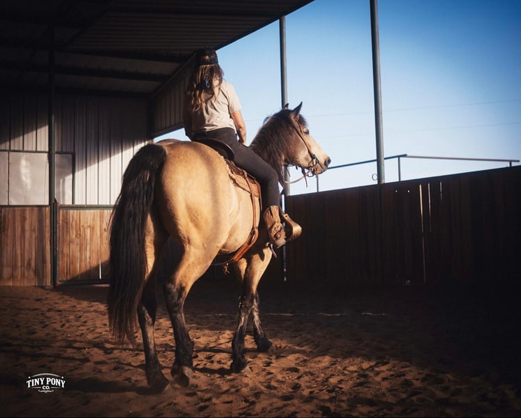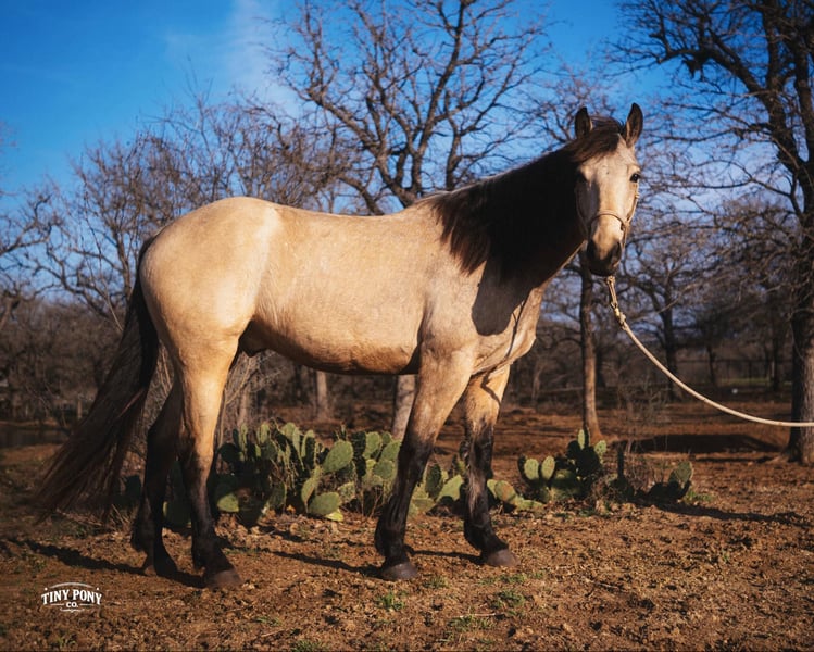 "AVAILABLE ON ONLINE HORSE AUCTION AT www DOT PlatinumEquineAuction DOT com BIDDING OPEN NOW thru SUNDAY | MARCH 29TH! *Final price will be determined on auction site* CONSIGNOR CONTACT INFO: Tiny Pony Co. 406-250-9530 LOCATION: Jacksboro, TX Story was born confident and brave. This honest gelding has one of those minds that you only find once in a blue moon. He is cool, calm and collected and will do anything you ask of him. He is gentle on the ground and in the saddle. Not only is he intelligent, he is gorgeous - who doesn’t want a 4 year old 16.2h Buckskin Percheron x QH that is so versatile, he can do any job you want him to? We have had the pleasure of watching this gelding mature - he has been a part of our herd since he was two. We have seen him in the high desert, where he was unfazed by loud noise and high winds. We have ridden him out solo in the hills of Montana and he never hesitated - he does not need a buddy to brave new territory. He is notably surefooted, level-headed and steady. He has never made a misstep or offered us any silly behavior. He stands still to mount and is very easy to catch - he would never leave you stranded in the backcountry. Story shows genuine excitement when learning new things and you can always feel the lightbulb go off when he gets it - and he remembers what you’ve taught him the next time you ask for it. His talent and athleticism make him a truly enjoyable horse to ride. He is broke to ride English and Western and is very light in the bridle without being touchy. He knows how to lope off with a kiss, open and close gates, and jumps with ease. (see his very first day of jump training in his video!) While he is happy to move out when asked, the draft horse side of him still prefers a nice, leisurely walking pace. Take him and finish him out - he would make a trusted trail partner, handy ranch horse, or excellent fox hunting prospect. Story is quiet and easy in a stall or run, but is also comfortable living out in a herd - he is generally near the top of the pecking order, but is not rude about it. He loads and unloads with ease and stands peacefully for the farrier. He is an easy keeper, currently on a forage only diet. He is sound, requires no maintenance and has freshly floated teeth. He does have a tiny, healed corneal scar (right eye) that is purely cosmetic and does not affect his vision or performance in any way - cleared by a veterinary ophthalmologist in 2025 (happy to provide documentation to any prospective buyers). PPE welcome at buyer’s expense. Located in Jacksboro, TX. Text or call Courtney Maddux @ 406.250.9530 for with your questions! Tiny Pony Co. riders are 5’6 and 6’5 for reference.