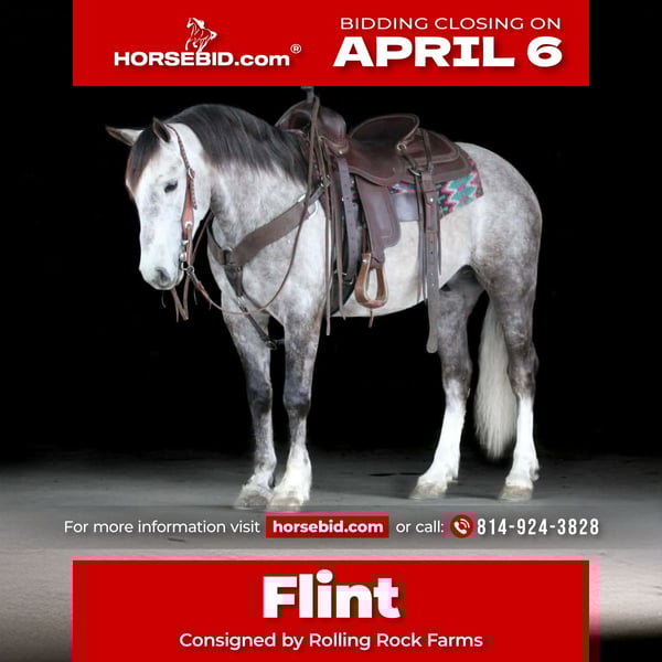 🌟𝑨𝒑𝒓𝒊𝒍 𝐀𝐋𝐋 𝐒𝐓𝐀𝐑 𝐋𝐈𝐍𝐄𝐔𝐏🌟 Happening now thru MONDAY | APRIL 6th - Available EXCLUSIVELY on HorseBid's website! For more details and to register visit: www.Horsebid.com CONSIGNOR CONTACT: Rolling Rock Farms 814-924-3828 LOCATION: Miola, PA BREED: Draft cross REGISTERED: No COLOR: Grey HEIGHT: 13.3 AGE: 5 GENDER: Gelding If you are looking for a flashy, well built, and broke gelding that stands out wherever he goes, Flint checks all the boxes. Flint is a 5 year old grey draft cross standing 13.3 hands tall, and he is as stout and well made as they come with big, solid feet and a strong, correct build. He is sound and ready to go to work. Flint is very well broke in the arena and rides around with a natural headset at both the trot and the lope. He is soft, responsive, and correct in his movement, making him enjoyable for a variety of riders. He will correctly pivot, side pass with ease, and has been exposed to obstacles such as flags and tarps with confidence. Outside of the arena, Flint is just as dependable. He rides out well and handles rough and difficult terrain without issue. He has been around dogs, cats, and goats, making him a great fit for a farm or busy environment. On the ground, Flint is easy to handle and good minded. He stands quietly to be bridled, saddled, brushed, and bathed, and he does well in the cross ties. He is comfortable being kept in a stall or turned out in the pasture and adjusts easily to different setups. Flint would be best suited for an intermediate youth or smaller adult rider. He has the versatility to be ridden both Western and English and has the ability to excel in either direction. With his looks, build, and level of training, Flint is the kind that will turn heads while also being a dependable partner you can enjoy every day. Be sure to watch his full video, as he truly speaks for himself. Located in Miola, PA Contact Ethan for more information (814) 924-3828