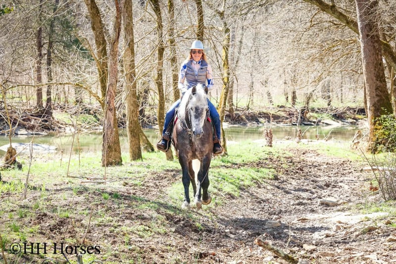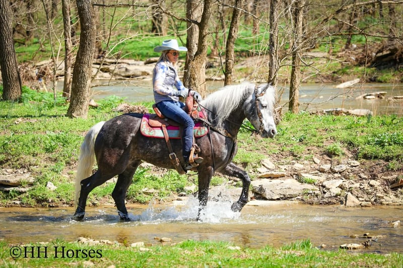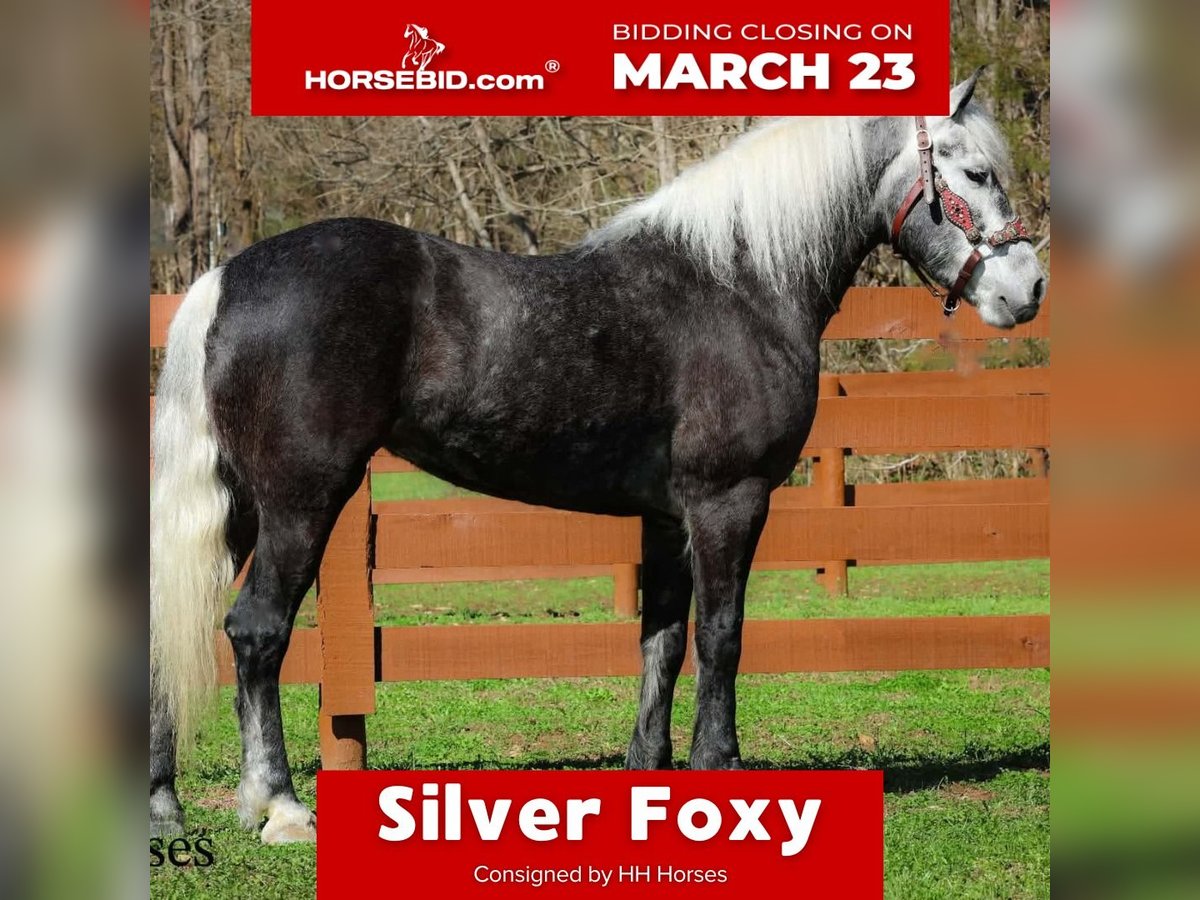⚜️𝓽𝓱𝓮 𝐆𝐎𝐋𝐃 𝓢𝓮𝓵𝓮𝓬𝓽⚜️ Happening now thru MONDAY | MARCH 23rd - Available EXCLUSIVELY on HorseBid's website! For more details and to register visit: www.Horsebid.com CONSIGNOR CONTACT: HH Horses 304-238-4155 LOCATION: Flemmingsburg, KY BREED: Draft Cross REGISTERED: No COLOR: Grey Dapple HEIGHT: 15.2 AGE: 5 GENDER: Mare This is "SILVER FOXY", a real attractive, gentle, well broke PERCHERON MORGAN CROSSBRED MARE that is broke to ride and drive. This mare oozes eye appeal. This mare has been trail ridden extensively, she has been through the cross country driving courses, and she aims to please. She stands a stocky 15.2 hands tall, she is 5 year old, and is a gorgeous dark silver dapple with a white mane, foretop, and tail. She has excellent ground manners, she stands to tack, harness, hitch, mount, and groom. She rides and drives out alone with no fuss, she goes anywhere you point her, and is extremely brave and confident. She is not marish, she gets along well with other horses, and she does whatever is asked of her with a can do attitude. She has pulled carts, wagons, and been hooked to farm machinery. She can carry a heavy rider and haul a heavy load under harness. She is sturdy and strong, yet gentle and easy to manage. She is user friendly, traffic safe, and not spooky. She lopes off with no hump and no buck. This mare is extra special with her coloring, her ride, her drive, and her personality. Don't miss out on a real unique and versatile horse.
