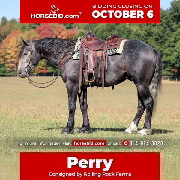 🍂 𝓐𝓾𝓽𝓾𝓶𝓷 𝑨𝑳𝑳 𝑺𝑻𝑨𝑹 𝑳𝑰𝑵𝑬𝑼𝑷 🍂 Happening now thru MONDAY | OCTOBER 6th - Available EXCLUSIVELY on HorseBid's website! For more details and to register visit: www.Horsebid.com CONSIGNOR CONTACT: Rolling Rock Farms 814-924-3828 LOCATION: Miola PA BREED: Draft cross REGISTERED: No COLOR: Grey HEIGHT: 15.3 AGE: 4 GENDER: Gelding Perry is a gorgeous 4 year old dapple grey draft cross gelding standing a solid 15.3 hands. His unique coloring and eye-catching presence turn heads everywhere he goes, and his quiet, confident demeanor makes him a joy to be around. Even though he is still young, Perry carries himself like a seasoned veteran. He rides with the kind of maturity and steadiness you normally only find in older horses. Under saddle, Perry is soft in the bridle, willing to learn, and extremely broke. He neck reins easily and stays light in the bridle, trotting around with an easy headset. His lope is smooth and balanced, and he catches both leads easily making him comfortable for long rides in the arena or out on the trail. Whether you prefer to ride in a saddle or bareback, Perry is equally steady and sure footed. This gelding has also been exposed to plenty of real world experiences that show off his versatility. He has been roped off of and will confidently drag a calf. He has carried the American flag with confidence. Out on the trail, Perry is the kind of horse you can count on. he moves through water, brush, and all kinds of rough terrain without a second thought. He is not spooky and stays level headed in new places and around new sights and sounds. Around the barn and in the pasture, Perry is easy to care for and easy to get along with. He does well whether kept in a stall or turned out in the pasture, and he is lower in the pecking order, making him a good fit in a mixed herd. He stands quietly to be saddled, brushed, and bathed, and stands good for the farrier. He currently wears four shoes and is kept up to date on his care. He sells with a current negative Coggins and a rabies vaccination, so he is ready to head straight to his new home. If you’re looking for a young horse with the mind of an experienced one, one that is handsome, broke, and already proven in and out of the arena, Perry is the complete package. For more information or to schedule a time to meet him, please contact Ethan at (814) 924-3828.